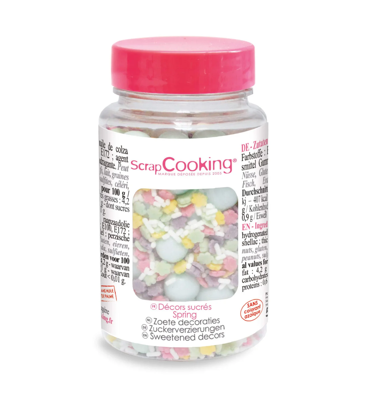 Parsemez vos pâtisseries de décoration comestible aux couleurs printanières et réconfortantes avec ce pot de décors sucrés de Scrapcooking.