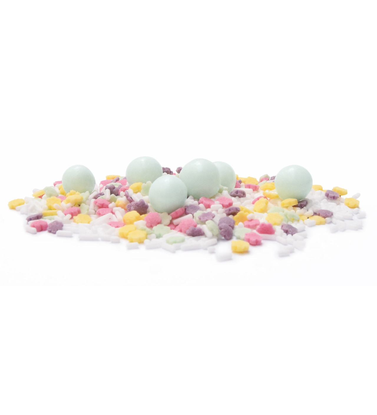 Cet assortiment de 80g est conditionné dans un pot refermable à la fois pratique et compact qui vous permettra de conserver vos décors en sucre pour pouvoir les réutiliser à votre guise. Ce pot de décorations pour gâteau se compose de perles en sucre couleur vert d’eau, de vermicelles blanches, ainsi que de petites fleurs aux couleurs pastel pour le côté printanier.