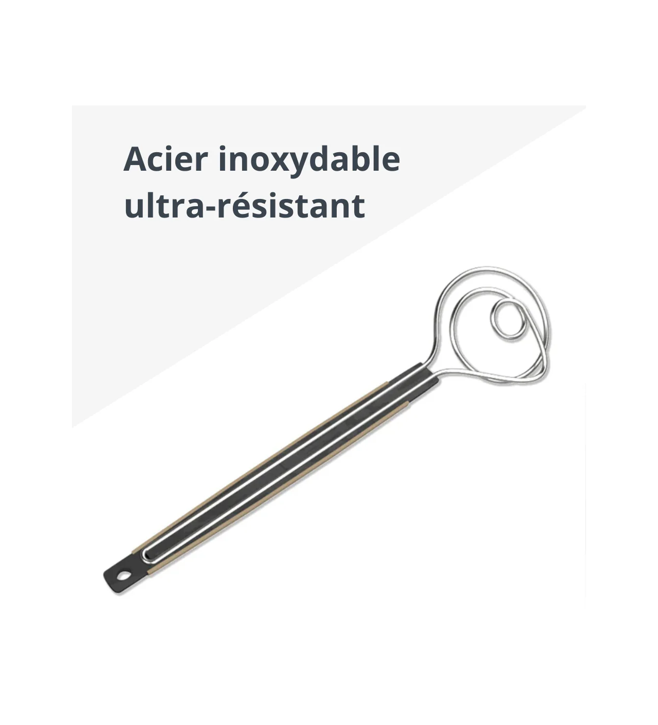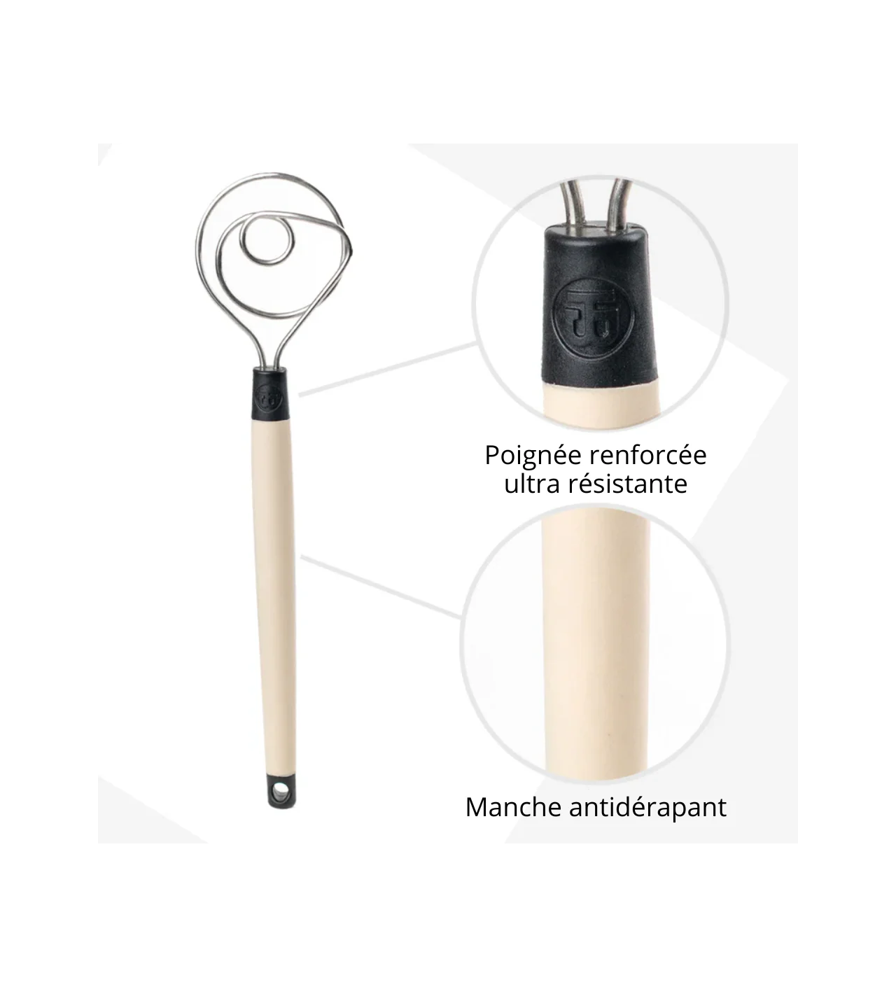 La tête du fouet pour pâte à pain est faite en inox très robuste, et son manche est en silicone antidérapant. Le tout est donc facile à manier et confortable en main. Pour vos pâtes à pains, à beignets, et vos levains, faites confiance au fouet à pâte Brod and Taylor.