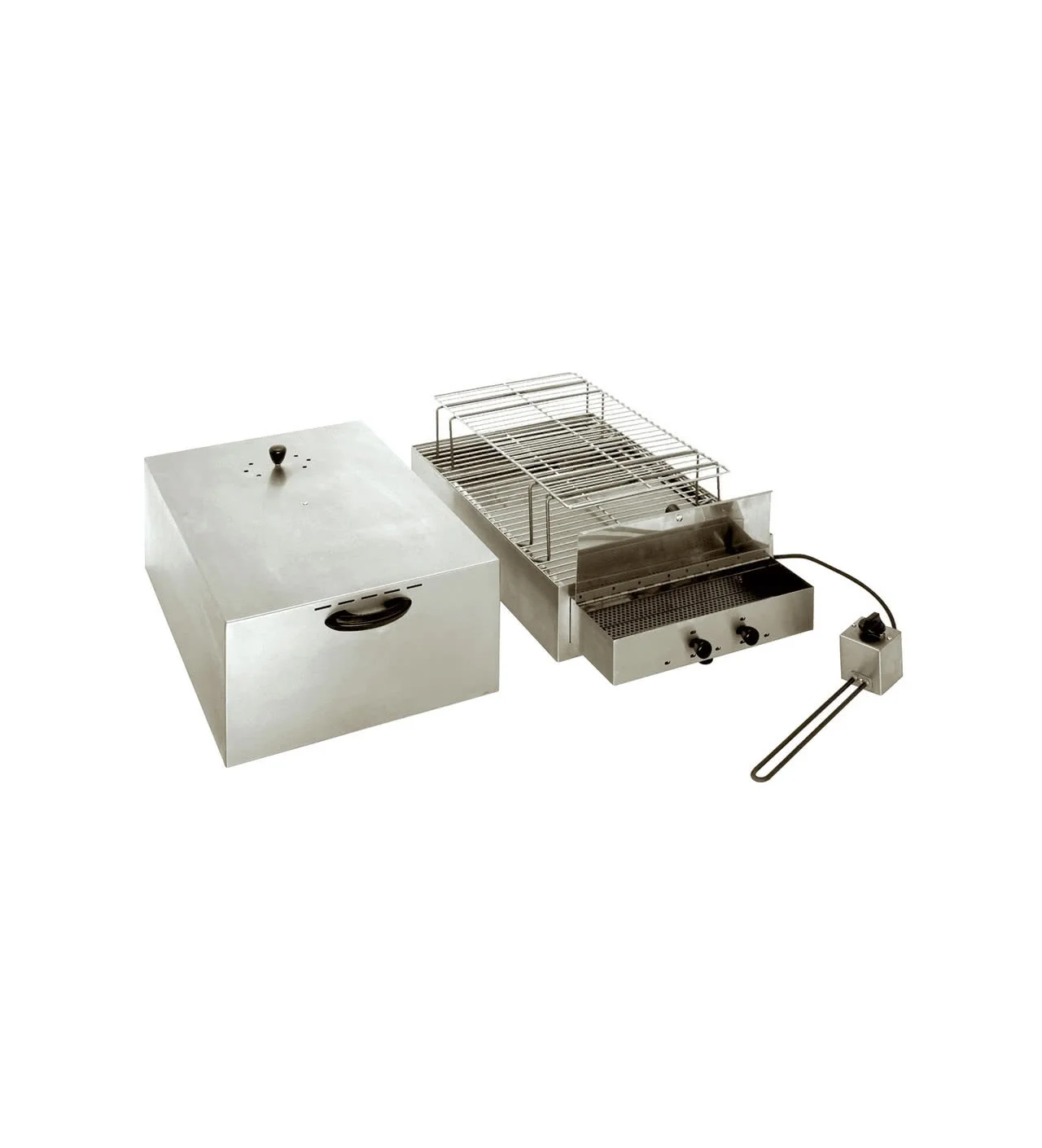 Révélez la saveur des aliments grâce au Fumoir à Froid. Celui-ci possède 2 étages : la grille supérieure mesure 54.5 x 34 cm, contre 60 x 40 cm pour la grille inférieure. Le fumoir à froid dispose d'une minuterie qui permet de contrôler l'allumage et la combustion de la sciure. Celle-ci prend place dans le tiroir extractible avec épingle chauffante.