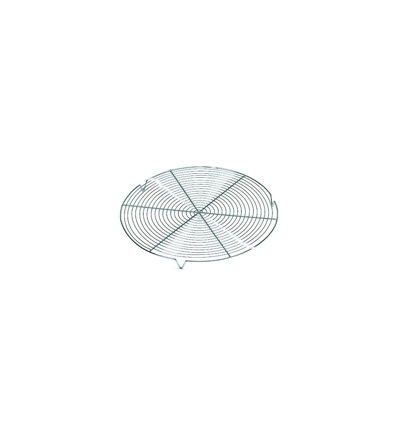 Grille ronde utilisée pour poser les gâteaux, tartes, pâtisserie à la sortie du four. La grille est surélevée par 3 pieds pour permettre la circulation de l'air sous la pâtisserie afin que cette dernière ne se ramollisse pas.