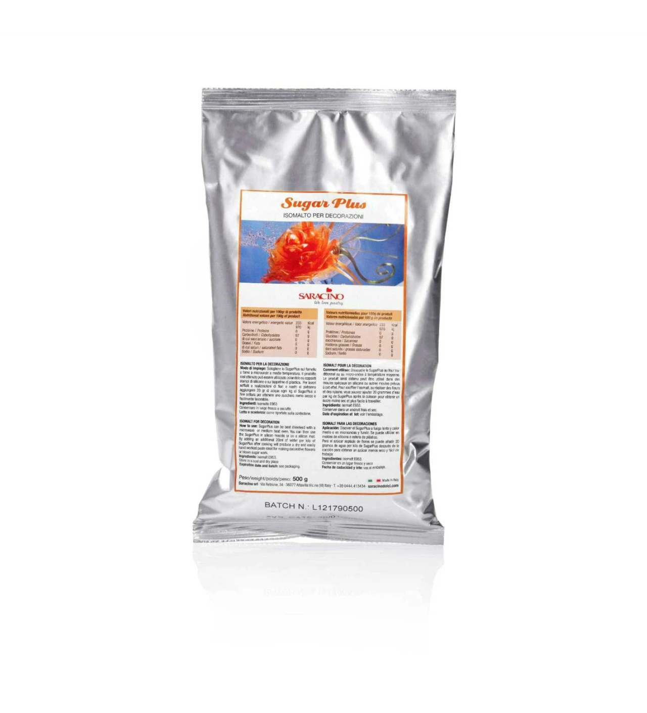 Fabriqué en Italie par Saracino, cet isomalt en poudre est prêt à être fondu et moulé selon vos envies. La texture lisse et translucide de l’isomalt E953 permet d’obtenir des finitions impeccables, idéales pour sublimer vos gâteaux, desserts et créations de cake design.