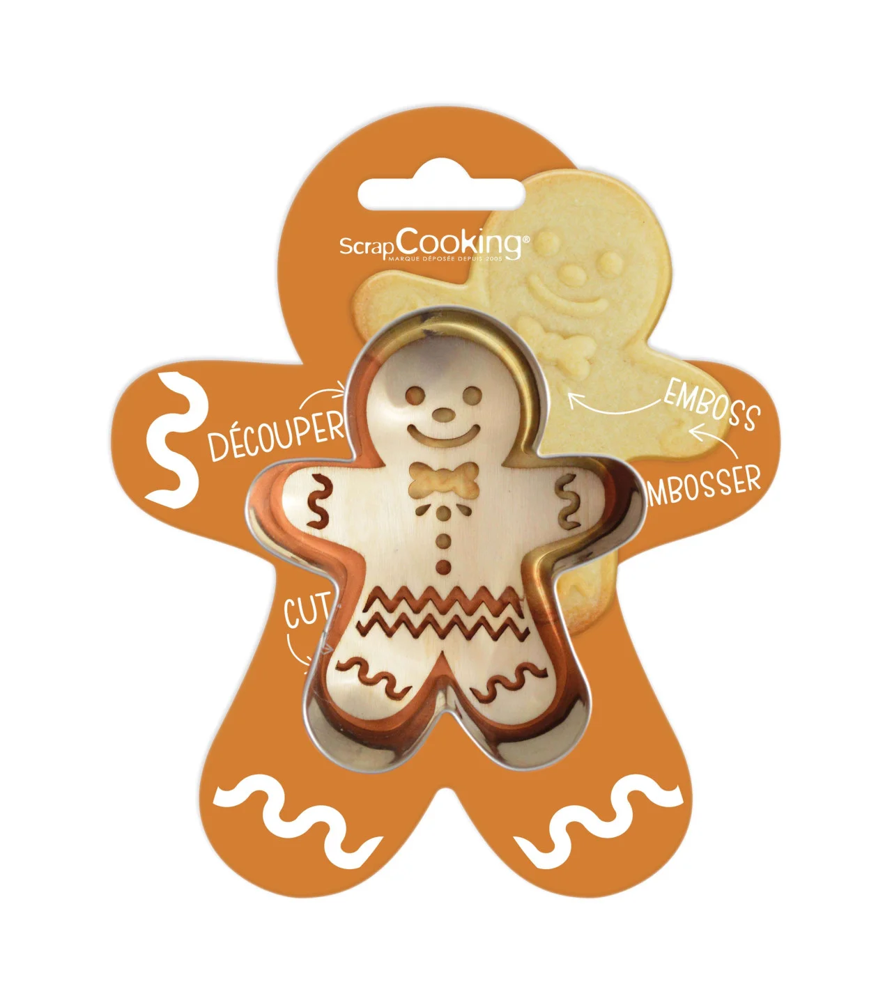 À offrir ou à garder dans votre cuisine, le coffret cadeau Scrapcooking est la solution idéale pour réaliser des biscuits de Noël festifs avec une pointe de féérie. L'emporte-pièce inox saura découper efficacement la pâte à biscuit en forme de bonhomme pain d'épice. La deuxième étape consiste à utiliser l'embosseur en bois naturel, afin d'imprimer un joli motif original et ainsi finaliser la décoration du biscuit. Dernière étape : enfournez après avoir placé vos biscuits au réfrigérateur pour que le motif ressorte correctement après la cuisson.