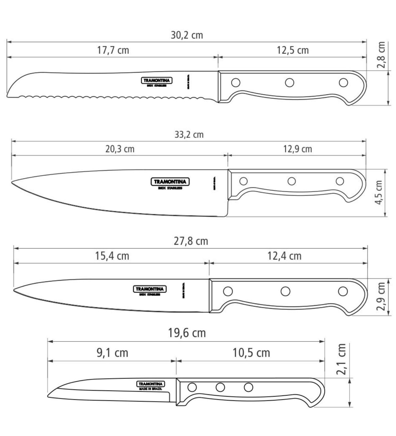 Comprenant un couteau à pain, un couteau de chef, un couteau universel, et un couteau à fruits et légumes, ce kit Tramontina couvre une grande majorité des découpes habituelles dans une cuisine. Chacun de ces couteaux supportera sans mal un usage quotidien et intensif. Cela est possible grâce à des matériaux sélectionnés pour leur résistance et travaillés pour supporter les conditions d’usages les plus rudes.