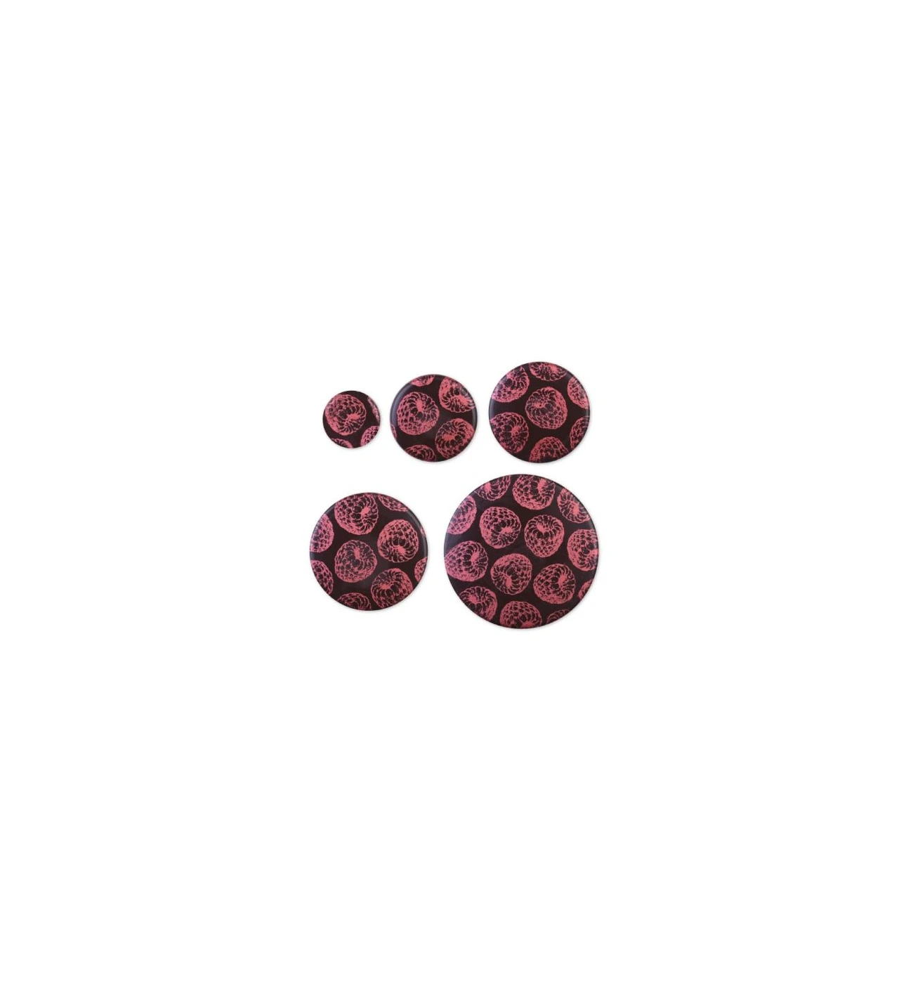 Pensés pour les professionnels comme pour les passionnés exigeants, ces décors ronds à motifs framboise apportent un contraste visuel chic et une touche gustative sophistiquée. Le goût profond du chocolat noir, subtilement relevé par la note acidulée de la framboise, sublime tous les types de desserts : entremets, tartes, mousses, cupcakes, bûches ou verrines.