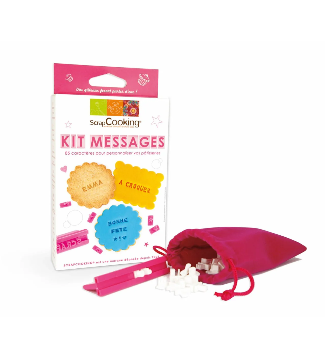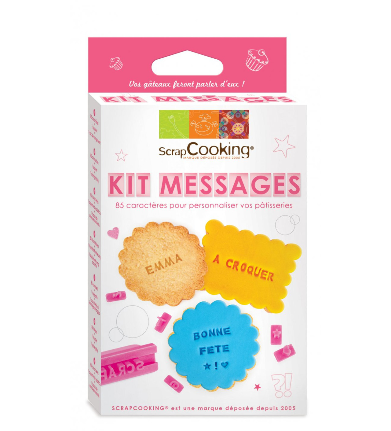 A l'aide du Kit Messages Scrapcooking réalisez très facilement des biscuits personnalisés : prénoms, voeux, messages de bonheur, dictons ... Les 85 emporte-pièces lettres, chiffres et symboles vous permettront de faire apparaître les messages de votre choix sur vos biscuits, décors en pâte à sucre ou pâte d'amande.