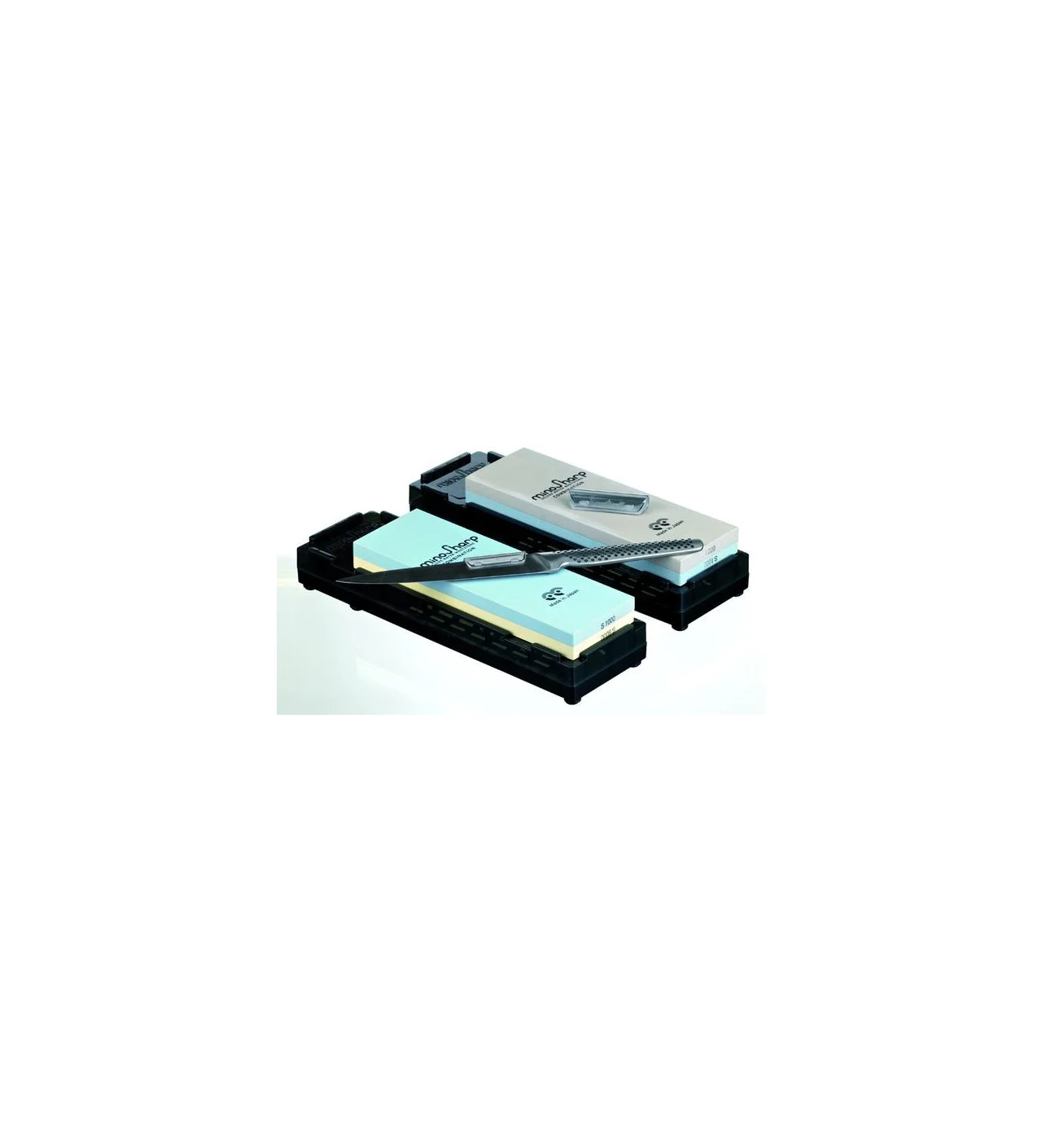 Kit comprenant : 1 pierre réversible à 2 grains différents (moyen et polissage), 1 jeu de 2 guides d'affûtage (1 guide pour couteau jusqu'à 150 mm, 1 guide pour couteau de plus de 150 mm) et une boîte de rangement qui fait également office de support de calage de la pierre pendant l'affutage.