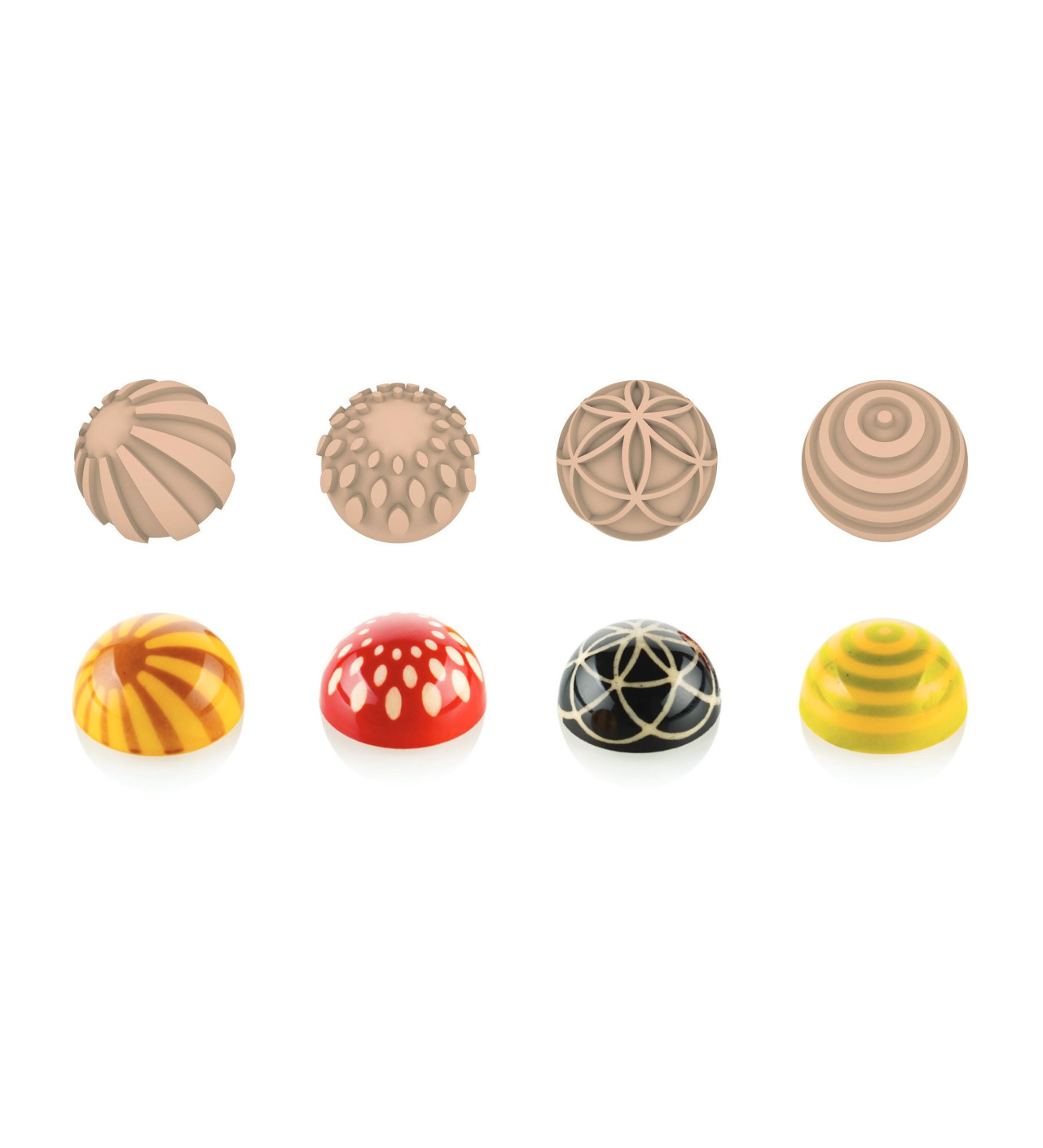Les tampons pour décor chocolat sont compatibles avec les moules en forme de demi-sphères dont les empreintes ont un diamètre de 3 cm. Tapissez ces derniers des couleurs qui vous plaisent puis apposez un des tampons Silikomart pour y laisser un dessin original. Après le démoulage de vos chocolats, vous obtiendrez des gourmandises aussi belles que délicieuses.