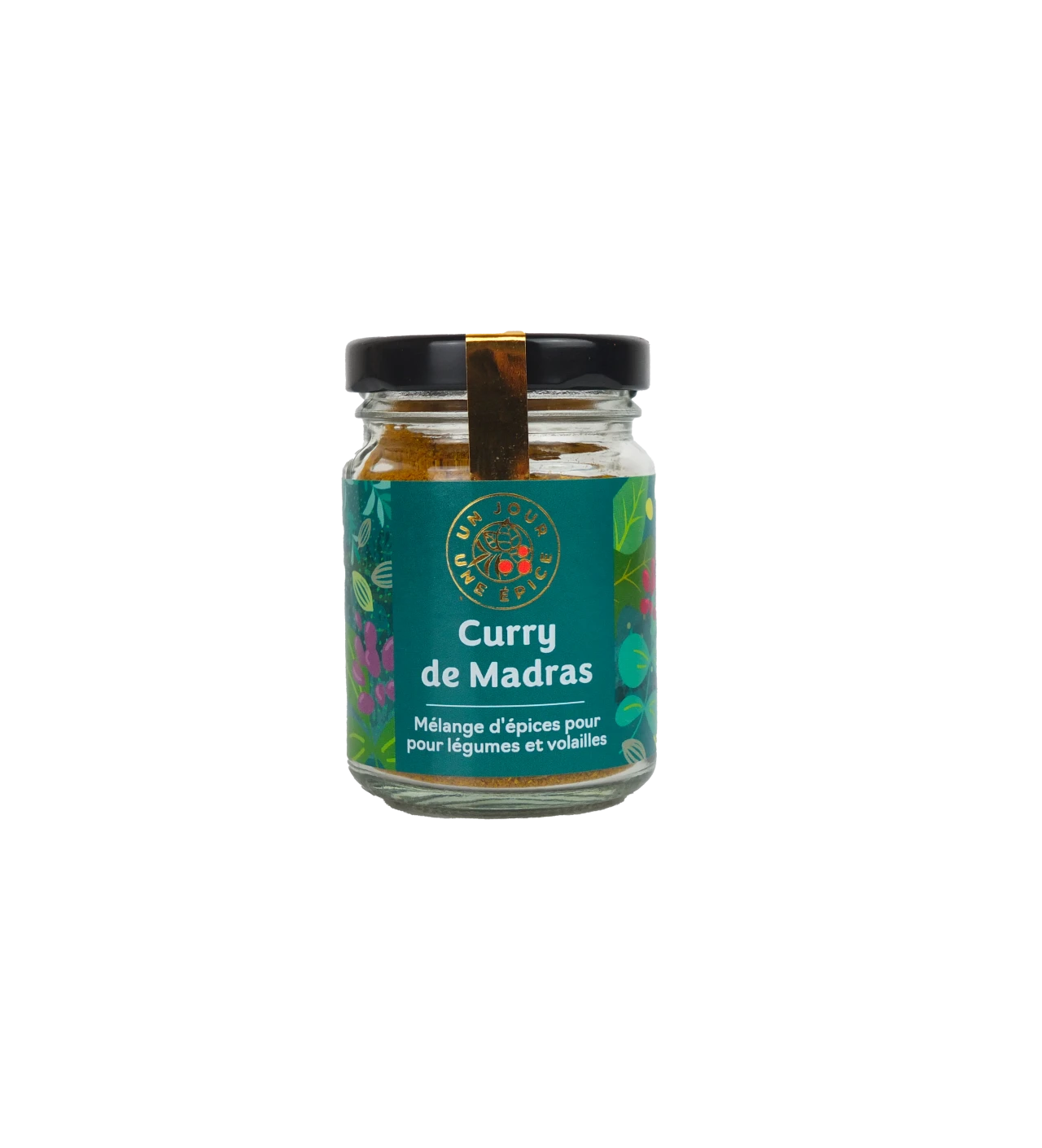 Incontournable de la cuisine indienne, le Madras Curry n'est pas particulièrement piquant mais se révèle très parfumé. Le madras curry Un Jour Une Epice se compose de coriandre, curcuma, fenouil, sel, fenugrec, carvi et piment. Si on le retrouve dans un très grand nombre de plats indiens, ce n'est pas pour rien : en effet, le curry madras se marie à presque tous les aliments, des viandes aux poissons sans oublier les légumes.