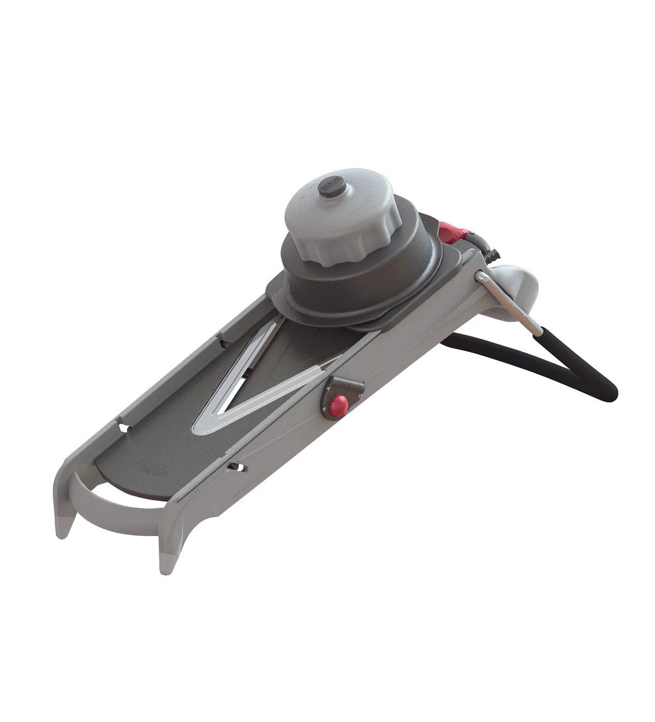 La Mandoline en V permet de réaliser des rondelles, des juliennes, des losanges ou des cubes. La mise en place des différents système de coupe est facile et rapide.