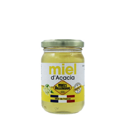 La couleur brun très clair de ce miel est visible grâce au conditionnement en pot de verre de 375 g.