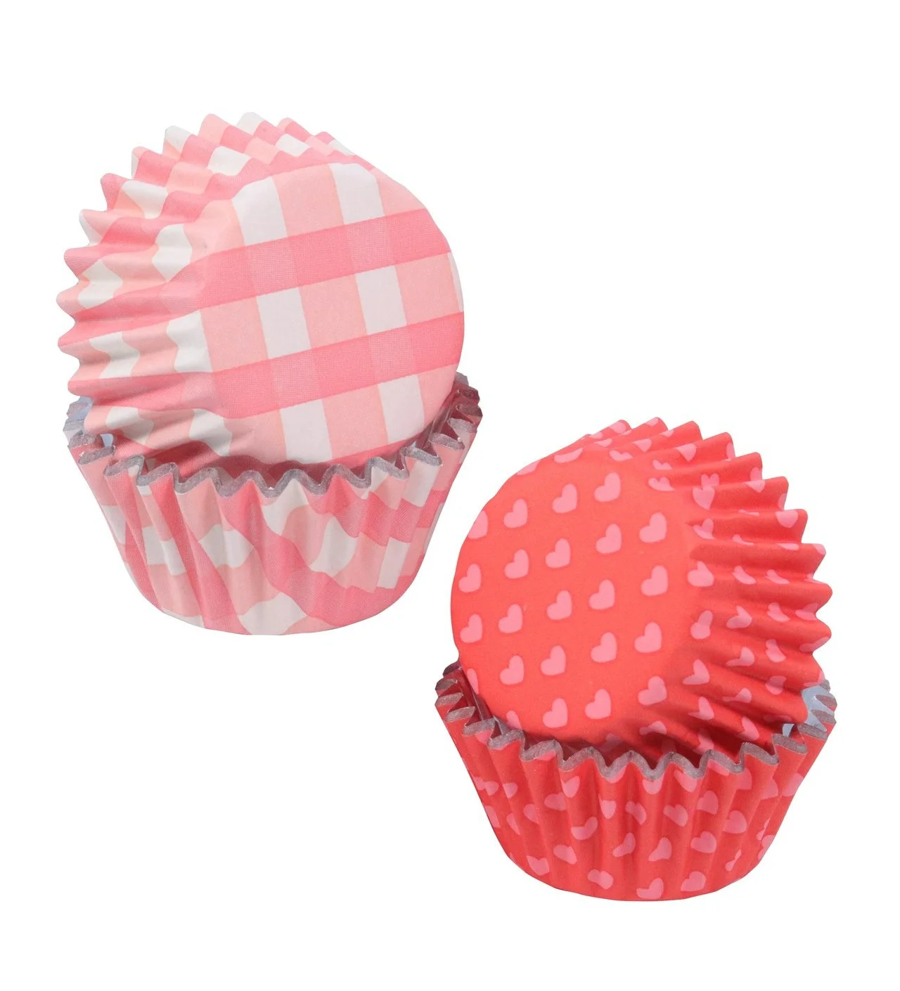 Ce lot de 60 caissettes muffins se compose de 2 designs différents, mêlant d’un côté cœurs romantiques dans des tons rouge et rose. Et de l’autre motifs carreaux vichy rose et blanc, pour une présentation charmante et raffinée.