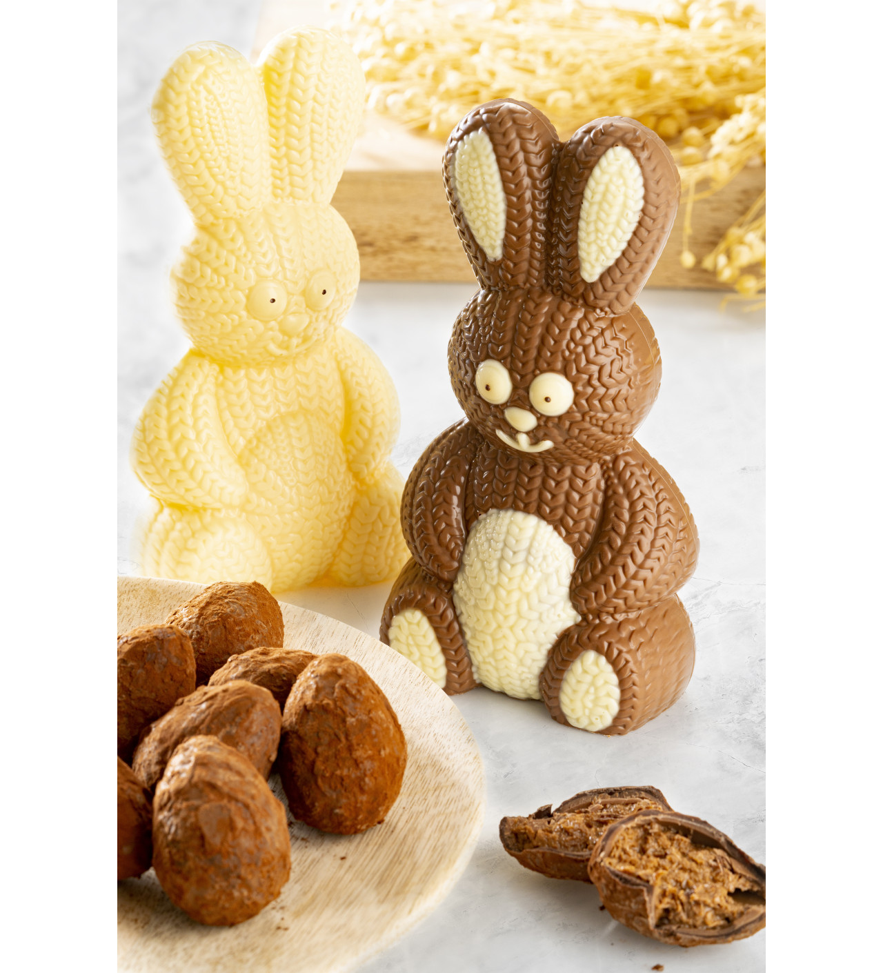 Allier la douceur d’une peluche tricotée à la gourmandise du chocolat ? C’est un défi relevé par Barry et son moule à chocolat lapin tricot.