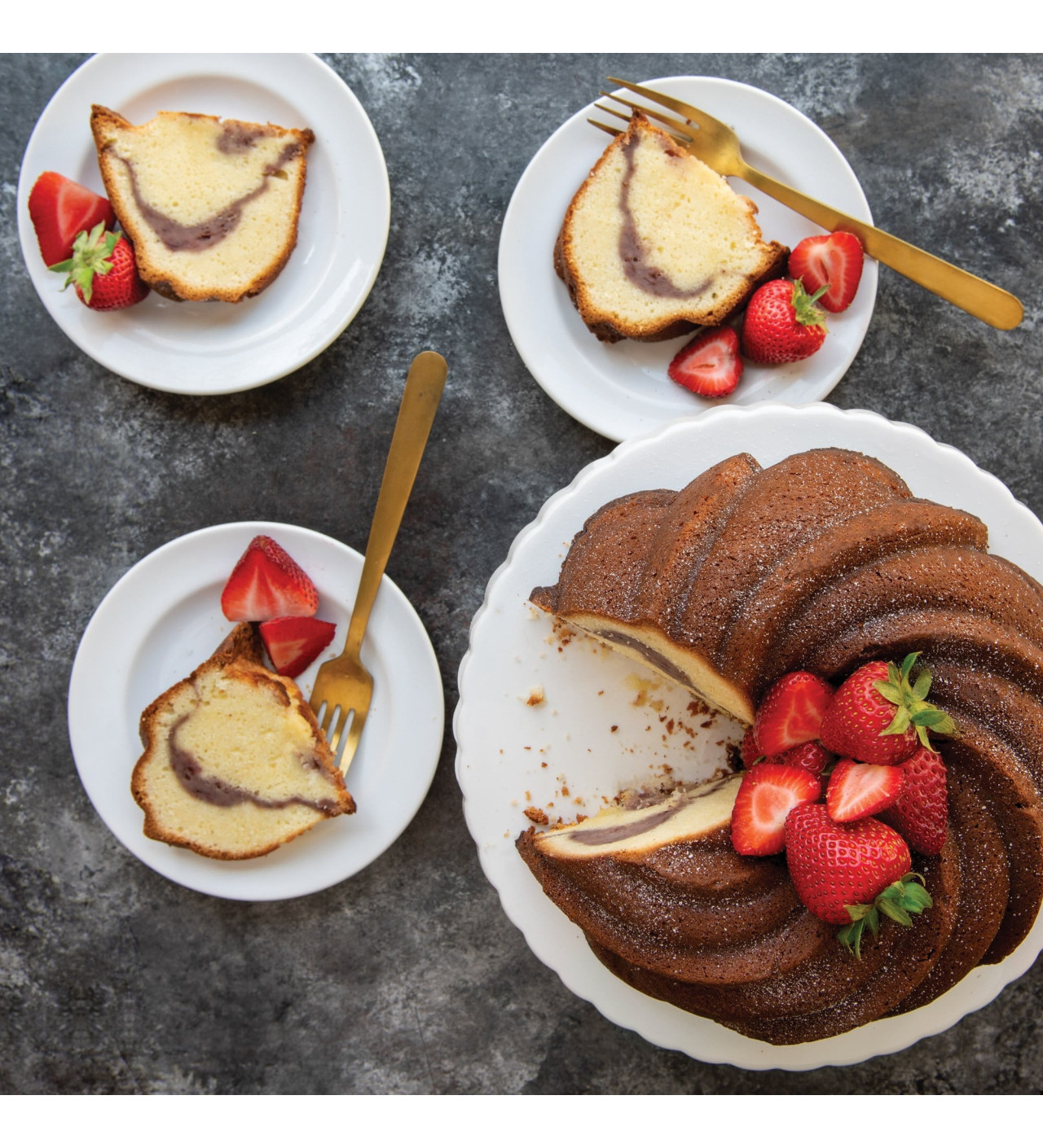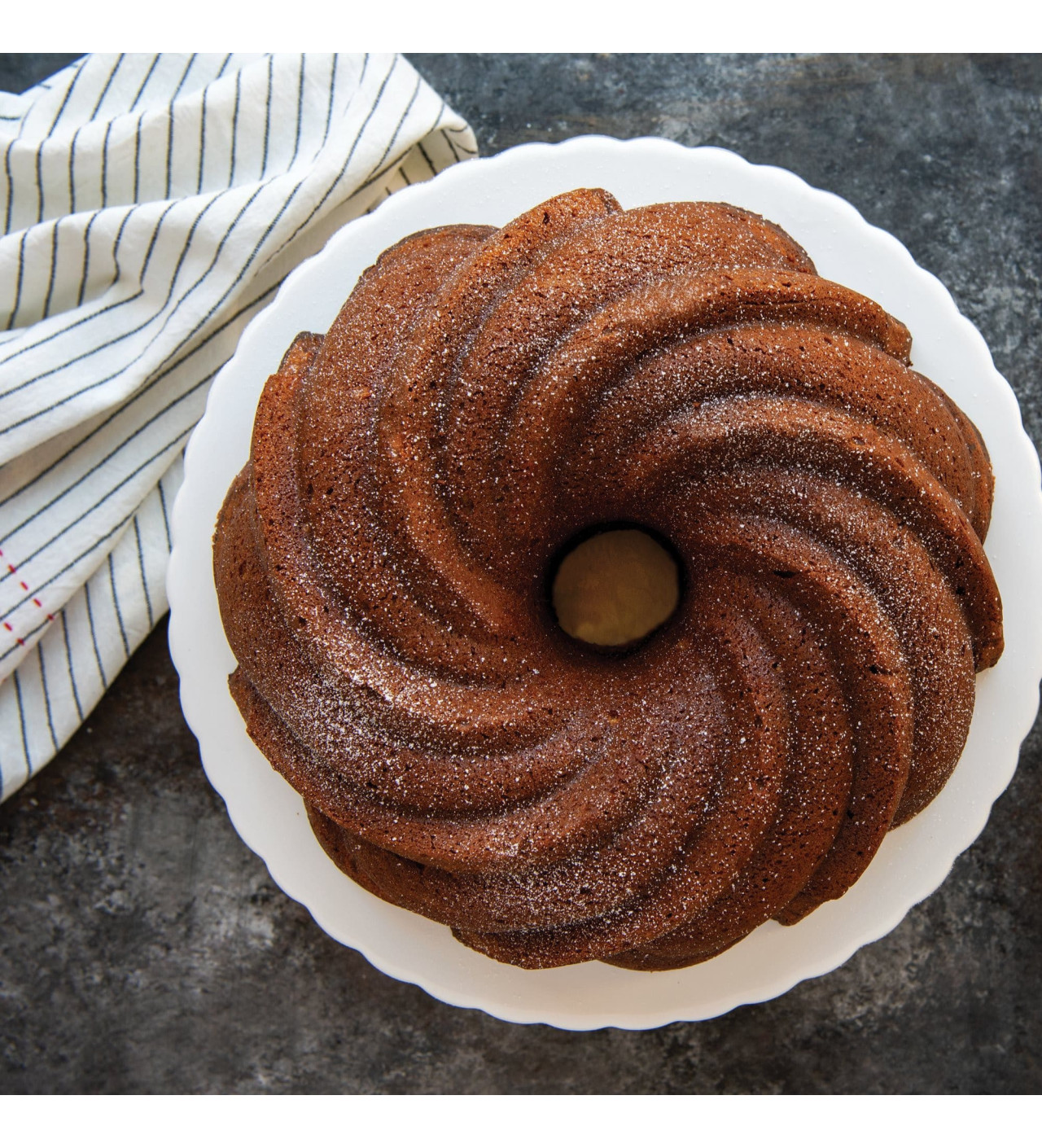 Préparez un appareil à gâteau savoureux, versez-le jusqu’au ¾ du moule tourbillon, laissez poser une dizaine de minutes afin que la pâte imprègne chaque courbe, et enfournez ou placez au congélateur. C’est là tout ce qu’il vous faut faire pour un obtenir un fabuleux dessert. Peu importe l’occasion, peu importe la décoration que vous placerez dessus, un gâteau confectionné ave le moule tourbillon Nordic Ware sera toujours exceptionnel.