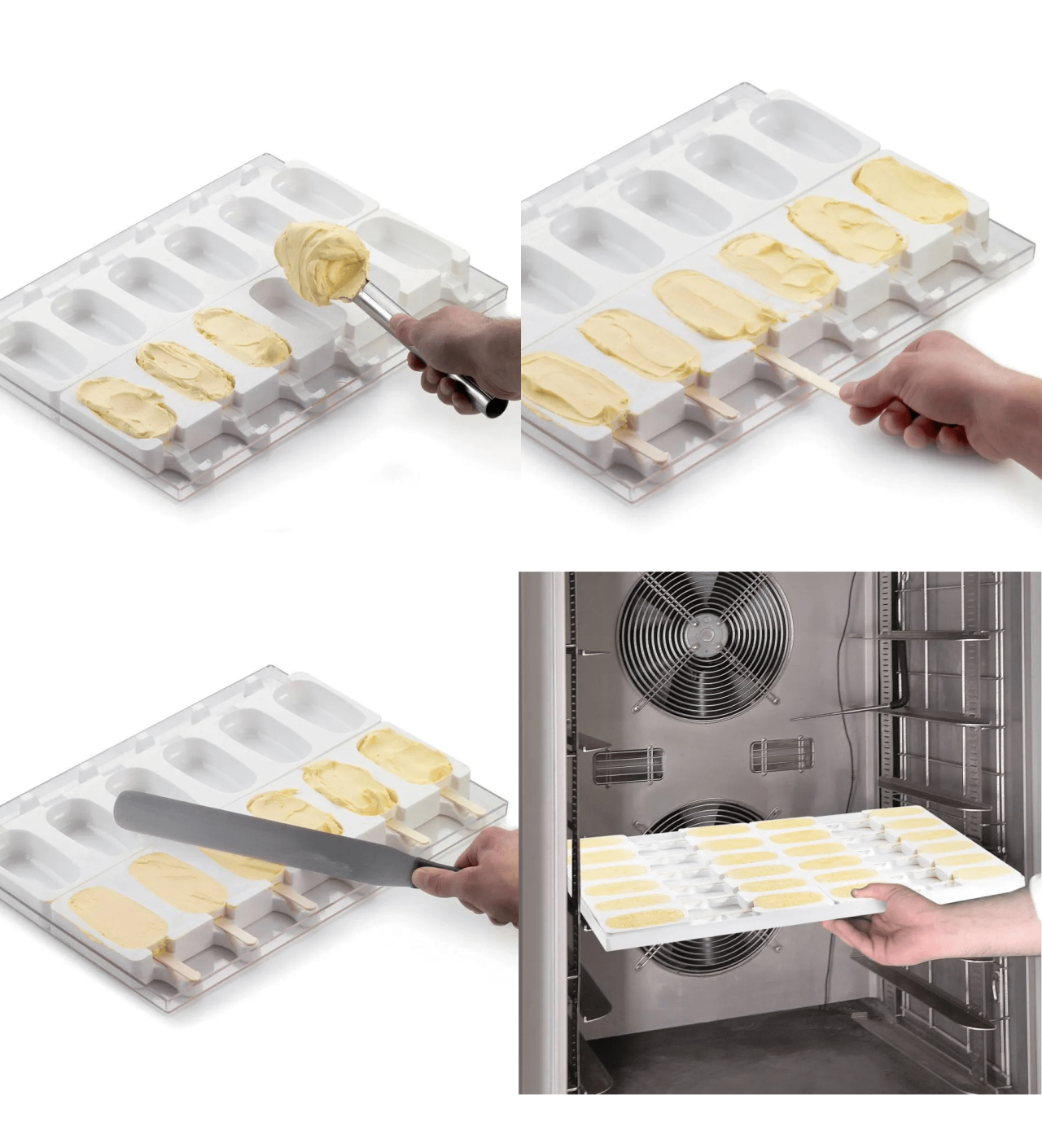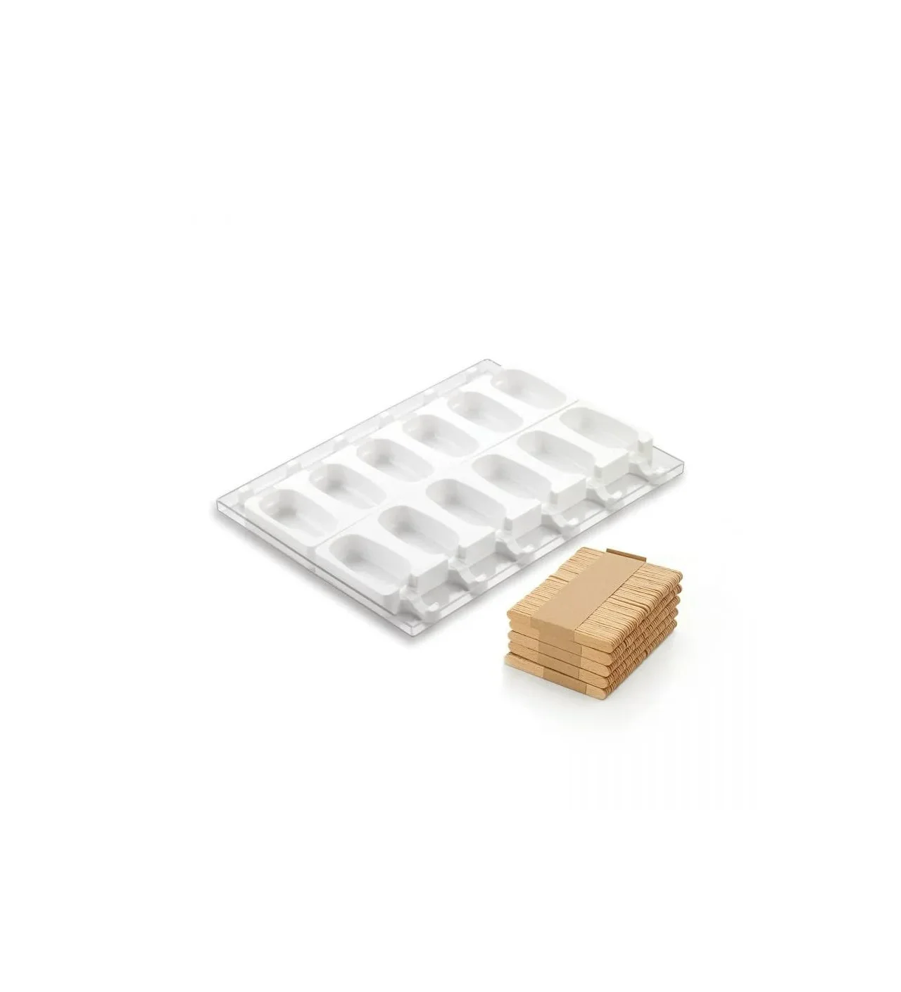 Vendu avec 50 bâtonnets en bois et une plaque support rigide de 40 x 30 cm, réalisez vos glaces maison sera un jeu d'enfants ! La plaque support vous permet de maintenir le moule en silicone et de le transporter aisément mettre votre préparation au congélateur. Après avoir garni les empreintes du moule à glace en silicone de la préparation de votre choix, plantez les bâtonnets en bois en passant par l'espace prévu à cet effet. Un petit revers en silicone vous permettra de maintenir votre bâtonnet bien droit pendant la prise de vos glaces. Le bâtonnet permettra ensuite d'avoir une prise en main facile pour démouler vos glaces.