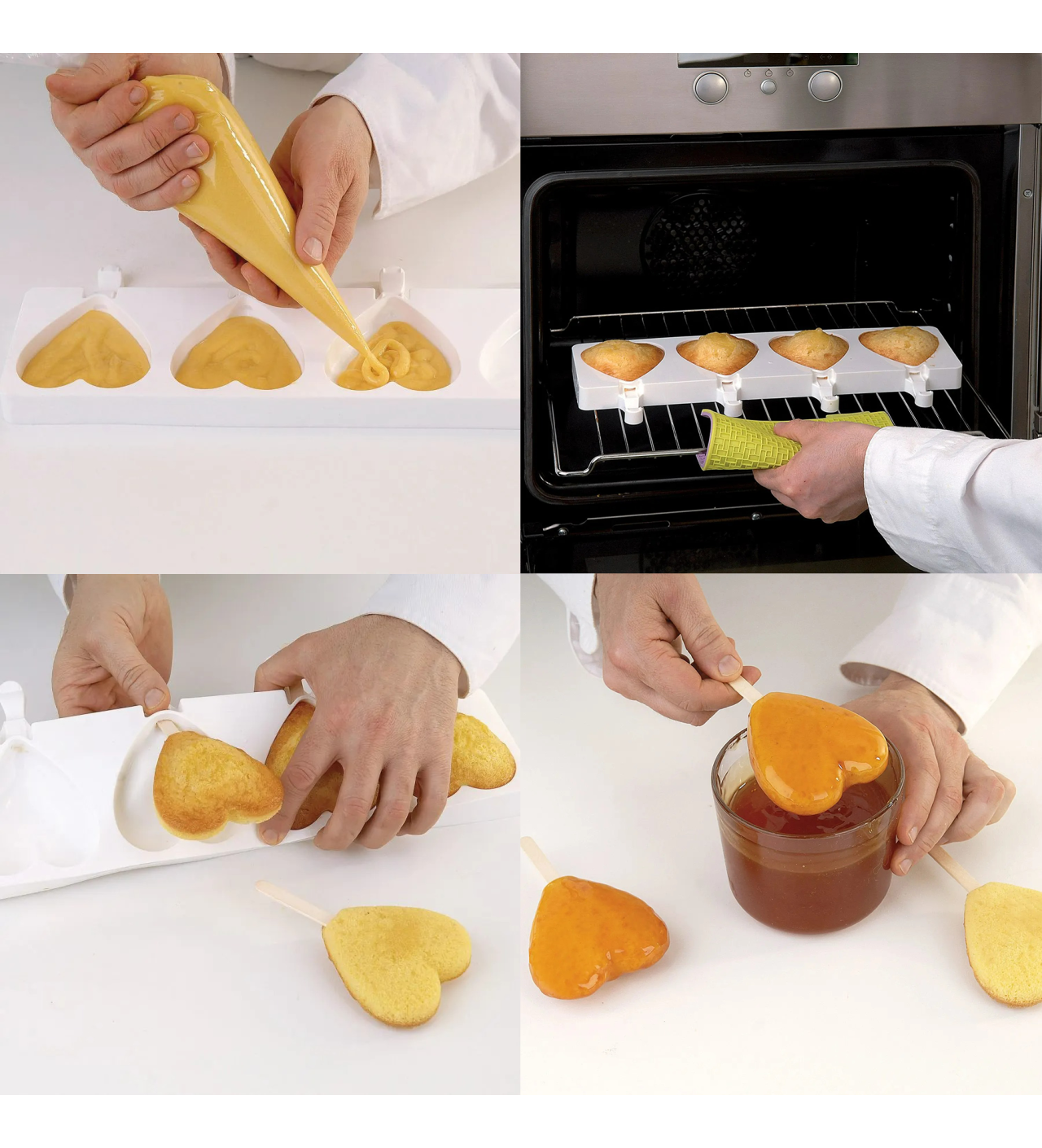 Ce moule silicone résiste à des températures allant de -60°C à 230°C pour une utilisation au congélateur, au réfrigérateur ou dans une cellule de refroidissement, mais également au four ou au micro-onde pour réaliser des gâteaux individuels à déguster directement sur le bâton.