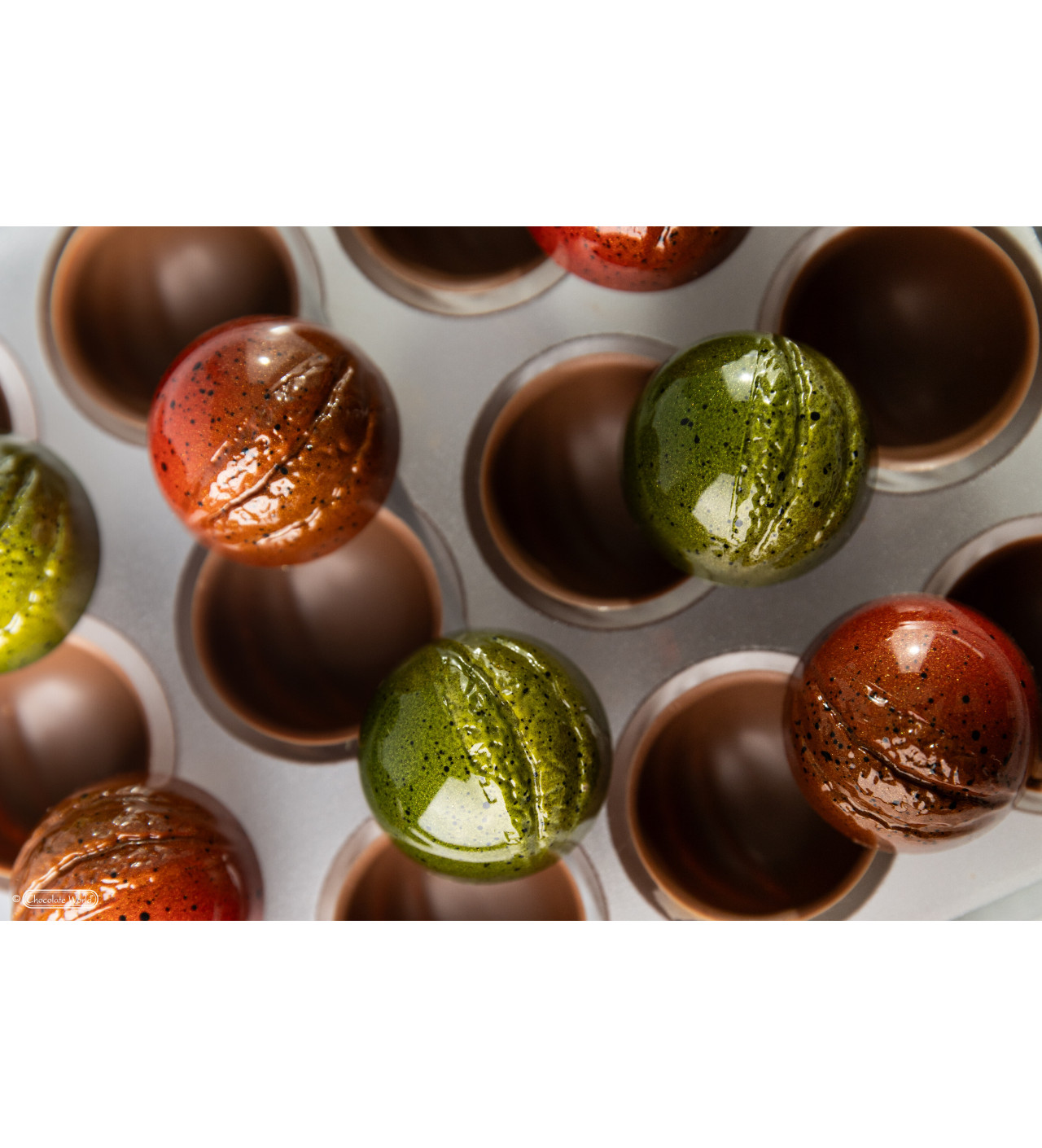 En effet, les 21 empreintes de ce moule sont parées de motifs faisant écho aux cabosses dont le cacao est issu. Vous pourrez donc rendre hommage à l’histoire du chocolat en créant des gourmandises dans le moule ADN du cacao.