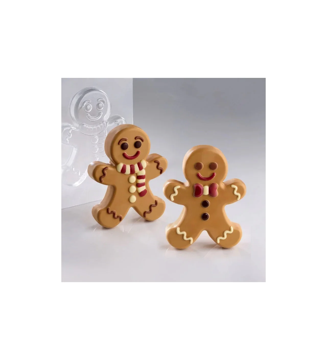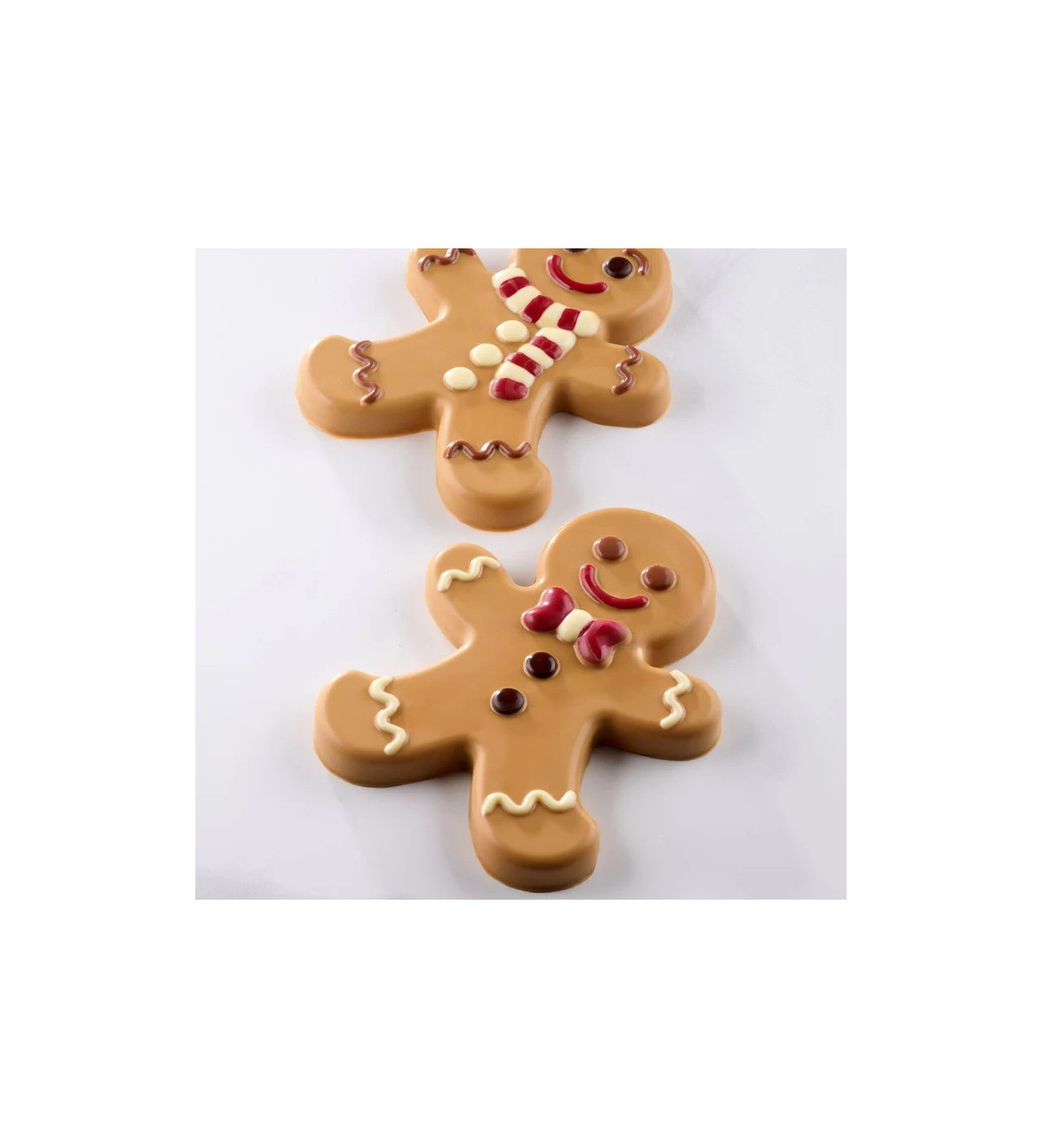 Ce kit festif contient 2 moules thermoformés pour créer 2 adorables bonshommes pain d’épices en chocolat, chacun richement décoré de détails en relief irrésistibles. Avec leurs 2 motifs différents, ces petits gingerbread de 12,8 par 16 cm prennent vie pour un rendu aussi gourmand que féerique.