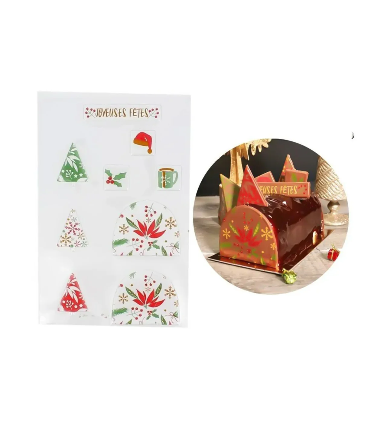 Pensé pour des décors élégants et festifs, ce moule transfert met à l’honneur des motifs typiques de Noël soigneusement détaillés. Il propose 9 moulages variés : sapins de Noël, carrés décoratifs, embouts de bûche et une plaque “joyeuses fêtes”, parfaits pour apporter une touche raffinée et harmonieuse à vos desserts.