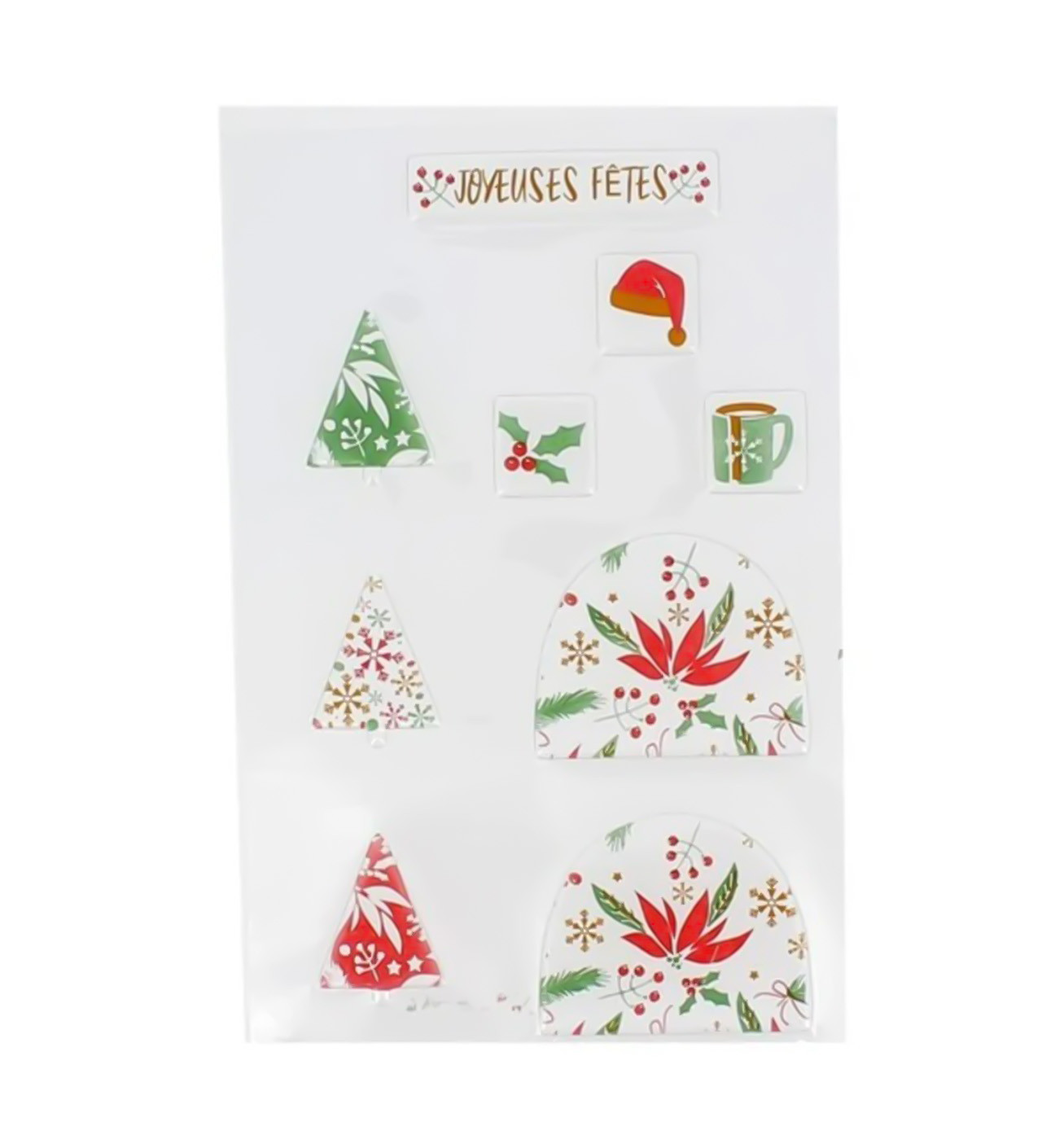 | Forme : | Sapins de Noël (3), carrés de Noël (3), embouts de bûche (2), banderole joyeuses fêtes (1) |