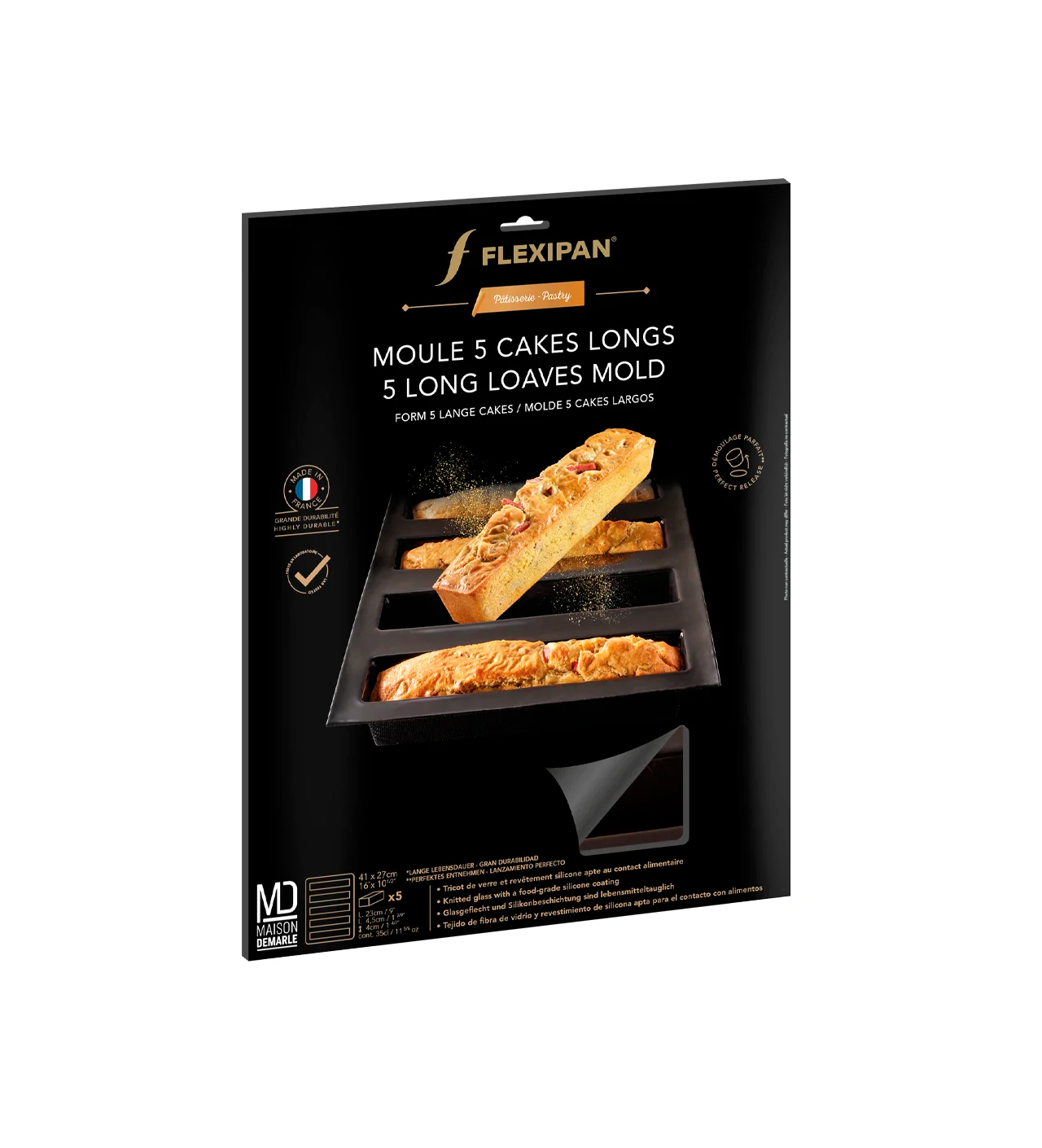 Fabriqué en France avec des matériaux de premier choix pour répondre à vos exigences de qualité, le moule à cakes longs Flexipan Demarle fait preuve d’une grande longévité. Cette robustesse est due à sa composition en tricot siliconé. Cette matière permet au moule Demarle de résister à des températures allant de -40 à +240°C. Il passe donc au four, au réfrigérateur, et au congélateur sans jamais perdre sa forme ou sa performance.