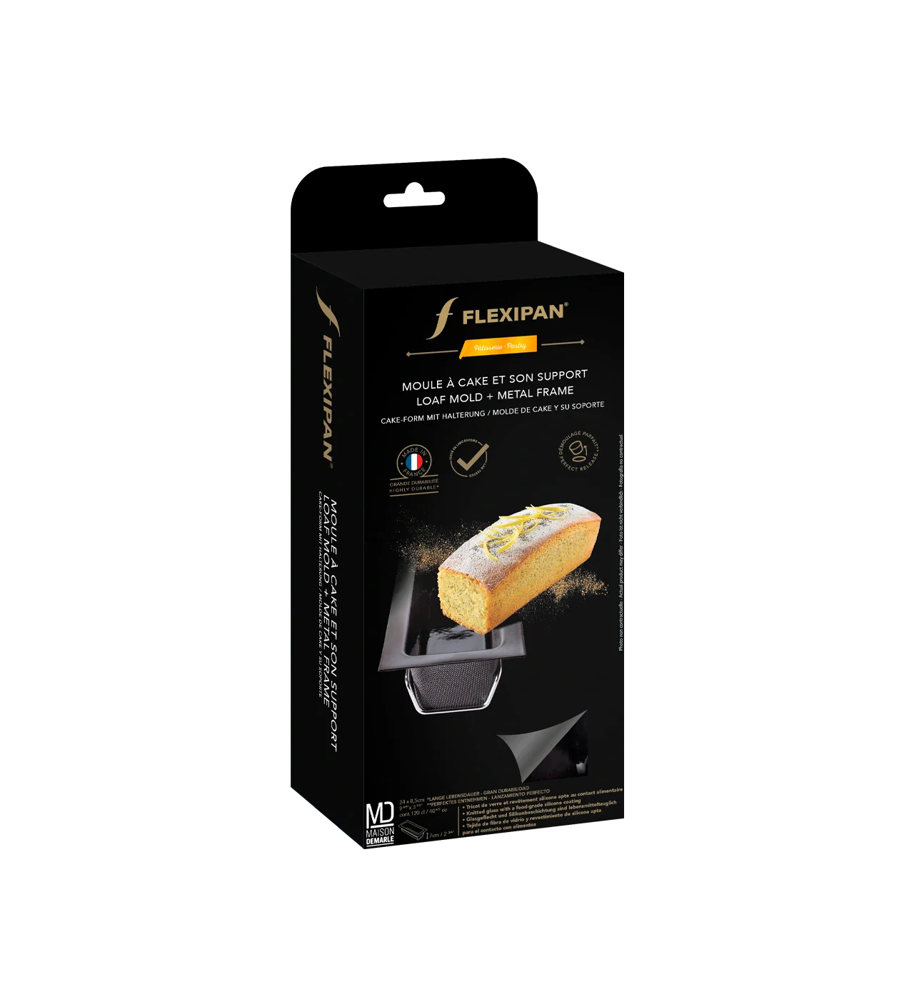 Le moule à cake Flexipan Demarle est accompagné d’un support qui permet de le maintenir stable et bien à plat lorsque vous y versez un appareil, pendant la cuisson, ou encore pendant la prise au froid. Cake aux olives, marbré, quatre-quarts et bien d’autres délices seront plus beaux encore grâce au moule pour cake et support Demarle.