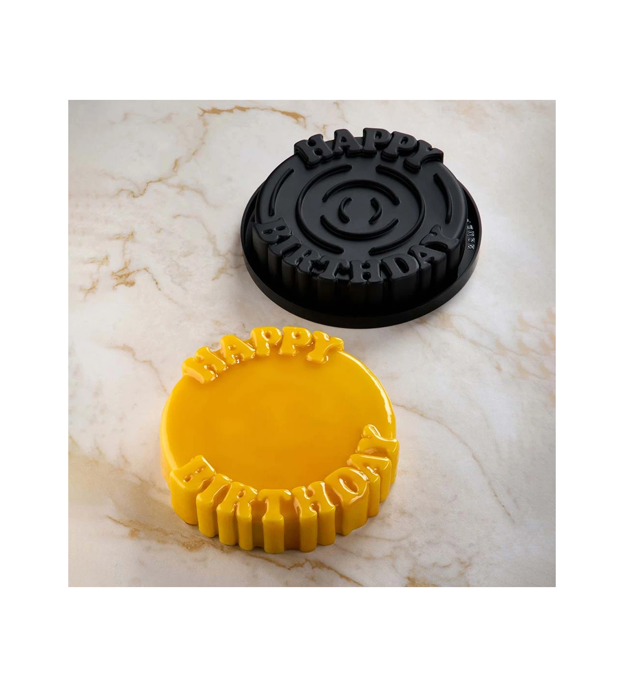 Ce moule rond, avec son diamètre de 19 cm et sa hauteur de 4,5 cm, est le choix parfait pour des créations gourmandes mémorables. Le design original en relief de ce moule à gâteau, arborant l’inscription "Happy Birthday", ajoute une touche de charme et de sophistication à vos pâtisseries.