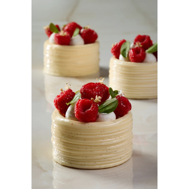 Ce moule en silicone abrite un feuilletage en trompe-l’œil, finement dessiné, imitant à la perfection les détails d’un pochage délicat. Avec ce moule rond, vous obtiendrez ainsi des entremets au relief élégant et moderne, aussi beaux à regarder qu’à déguster.
