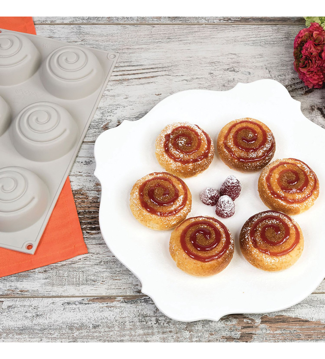 Grâce au moule silicone Mini Girotondo Silikomart 3D Design, vous obtiendrez 6 pâtisseries parfaitement rondes et légèrement bombées. La rondeur du gâteau est soulignée par le sillon présent sur la surface. Alliez esthétique et saveur en versant dans le sillon une crème, un coulis de fruits ou de chocolat, dont la couleur tranchera avec celle du gâteau.