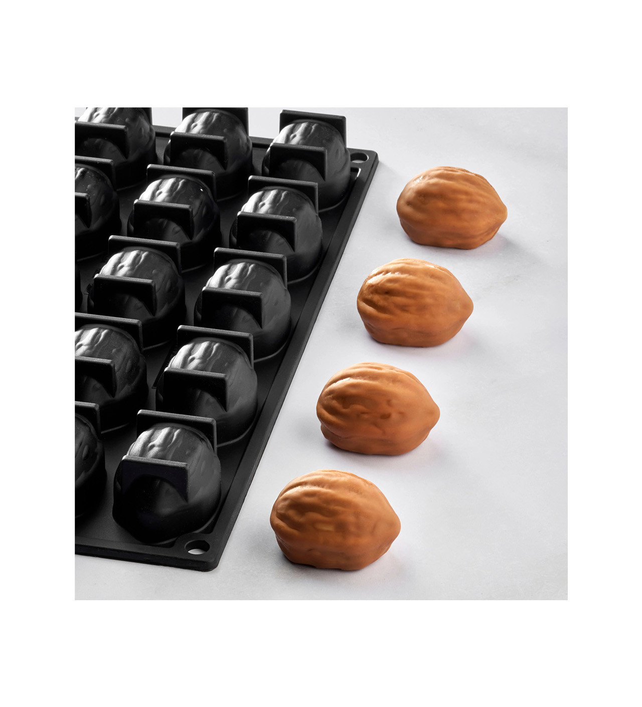 Avec ses noix en trompe-l'œil au design original et aux détails uniques, ce moule en silicone transforme vos préparations en bouchées aussi gourmandes que surprenantes. Chaque empreinte de ce moule trompe-l'œil reproduit fidèlement la forme robuste, protectrice et texturée de la coquille de noix, pour un rendu visuel irrésistible.