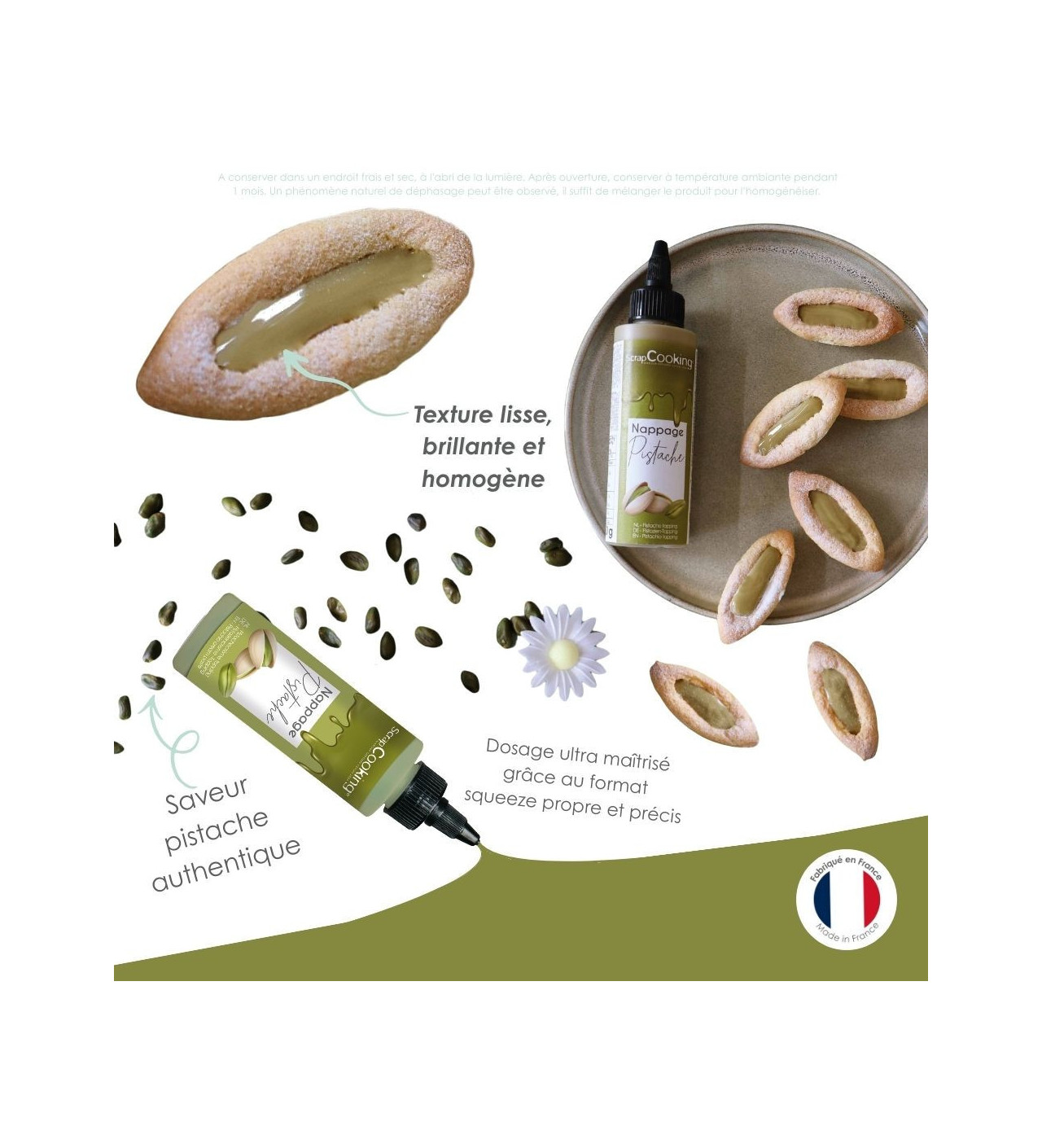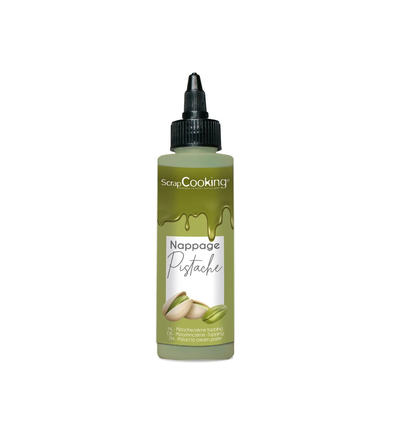 Le nappage à la pistache offre une couleur et un goût plaisant qui habilleront vos créations selon vos envies. Pour parfaire un entremets, mettre en valeurs de la glace, ou encore pour décorer des muffins, ce nappage Scrapcooking sera la touche finale parfaite.