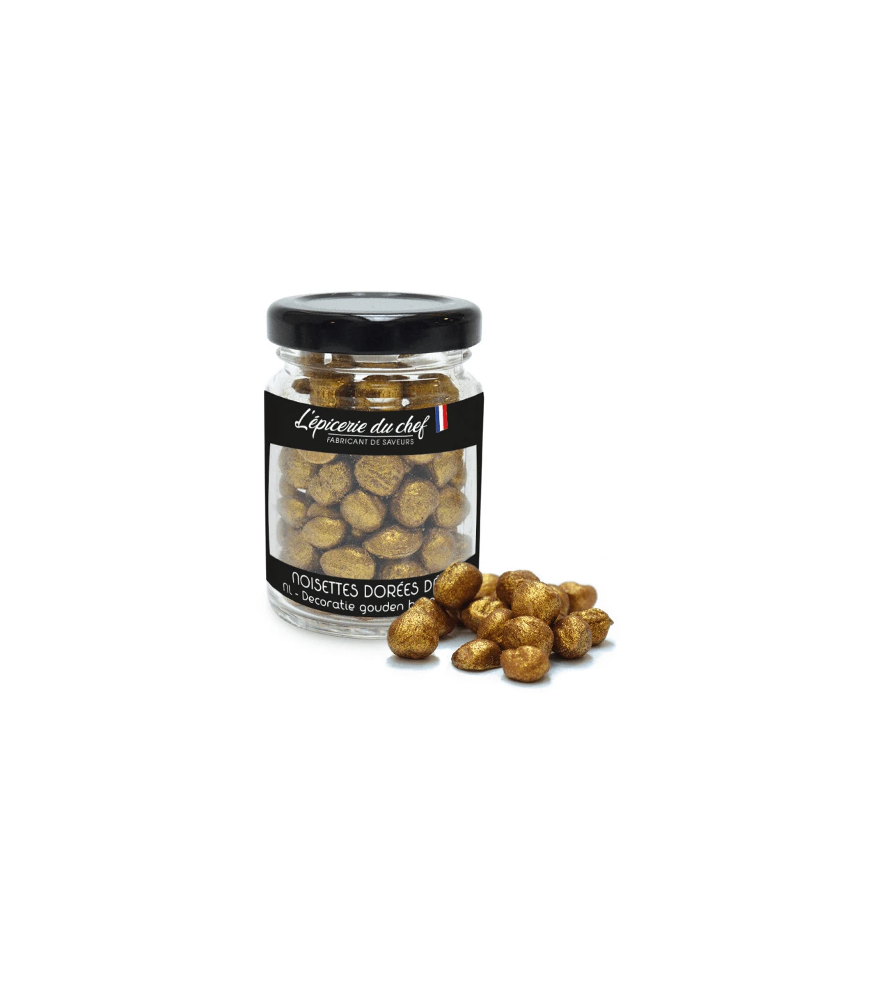 Proposées par la marque française L’Epicerie du Chef, ces noisettes entières sont recouvertes d’un colorant alimentaire sous forme de poudre dorée. 100% comestibles ces noisettes dorées donneront une touche croquante et brillante à vos pâtisseries.