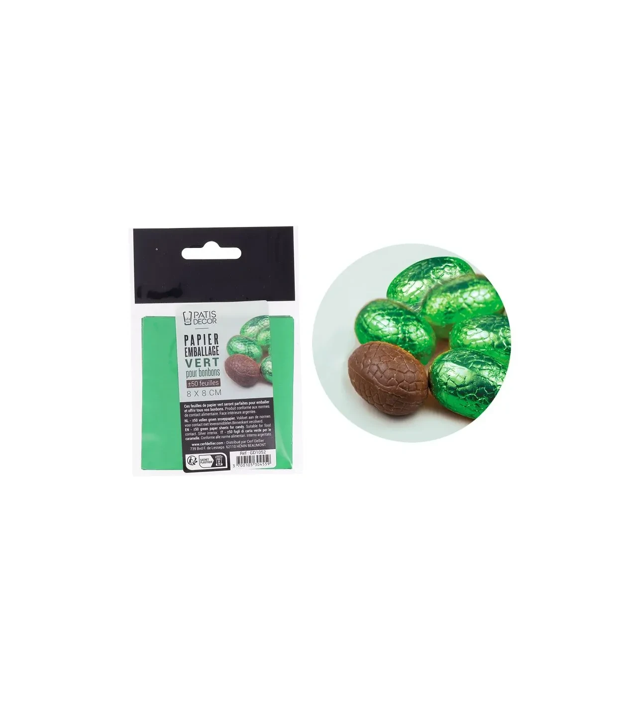 Apportez une touche d’élégance à vos créations chocolatées avec le Papier Vert Métallisé Emballage Bonbon (x50) Patisdécor.