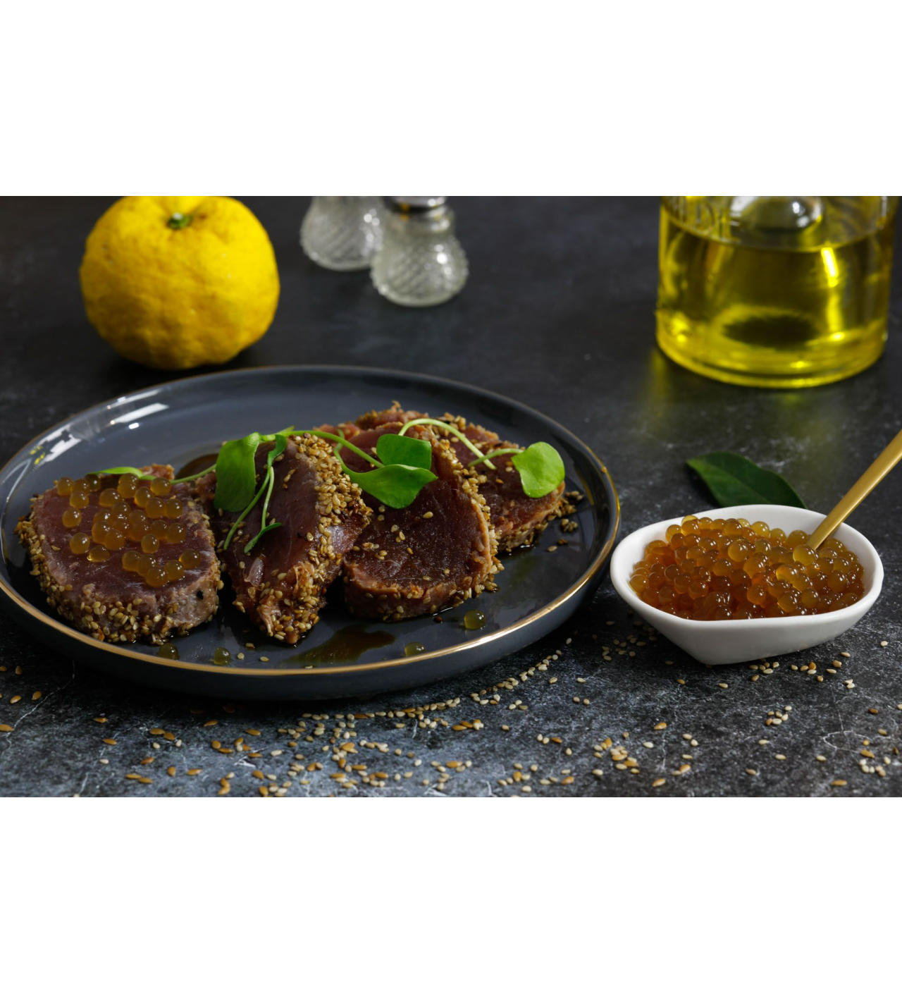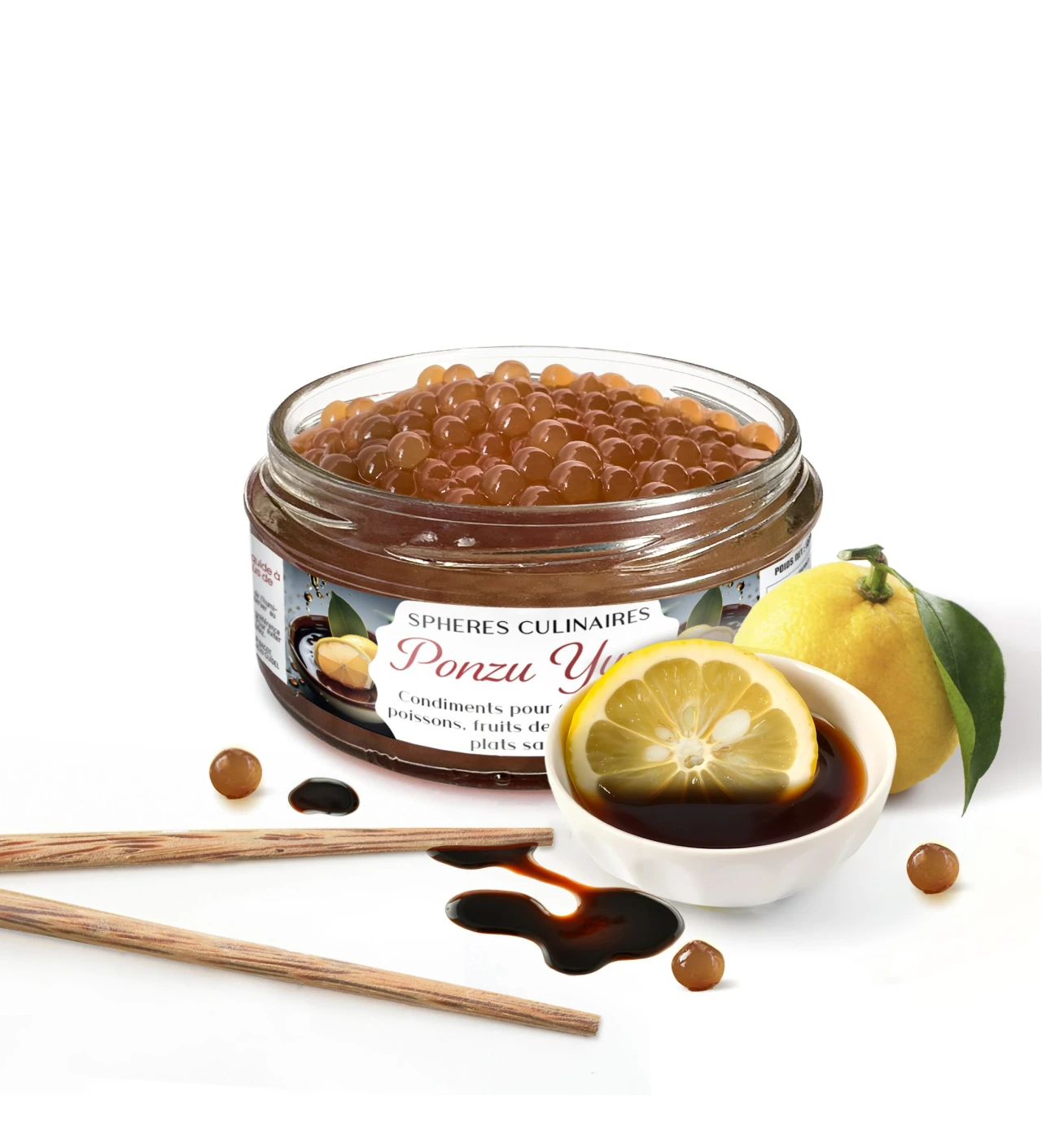 Ces petites perles rondes (diamètre de 4 mm) possèdent une pellicule croquante qui laisse place à un cœur liquide savoureux, mariant à la perfection le ponzu acidulé et le yuzu frais.