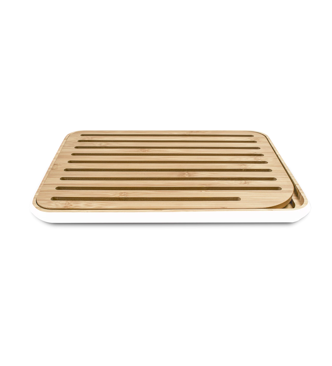 Possédant des contours de couleur blanche, la planche à pain Pebbly est fabriquée en bambou, un matériau naturel, résistant et léger. La planche à découper en bambou est équipée d'une grille amovible et ajourée pour laisser tomber les miettes dans le réservoir. La surface de découpe est alors toujours propre et les miettes de pain seront facilement récupérées.