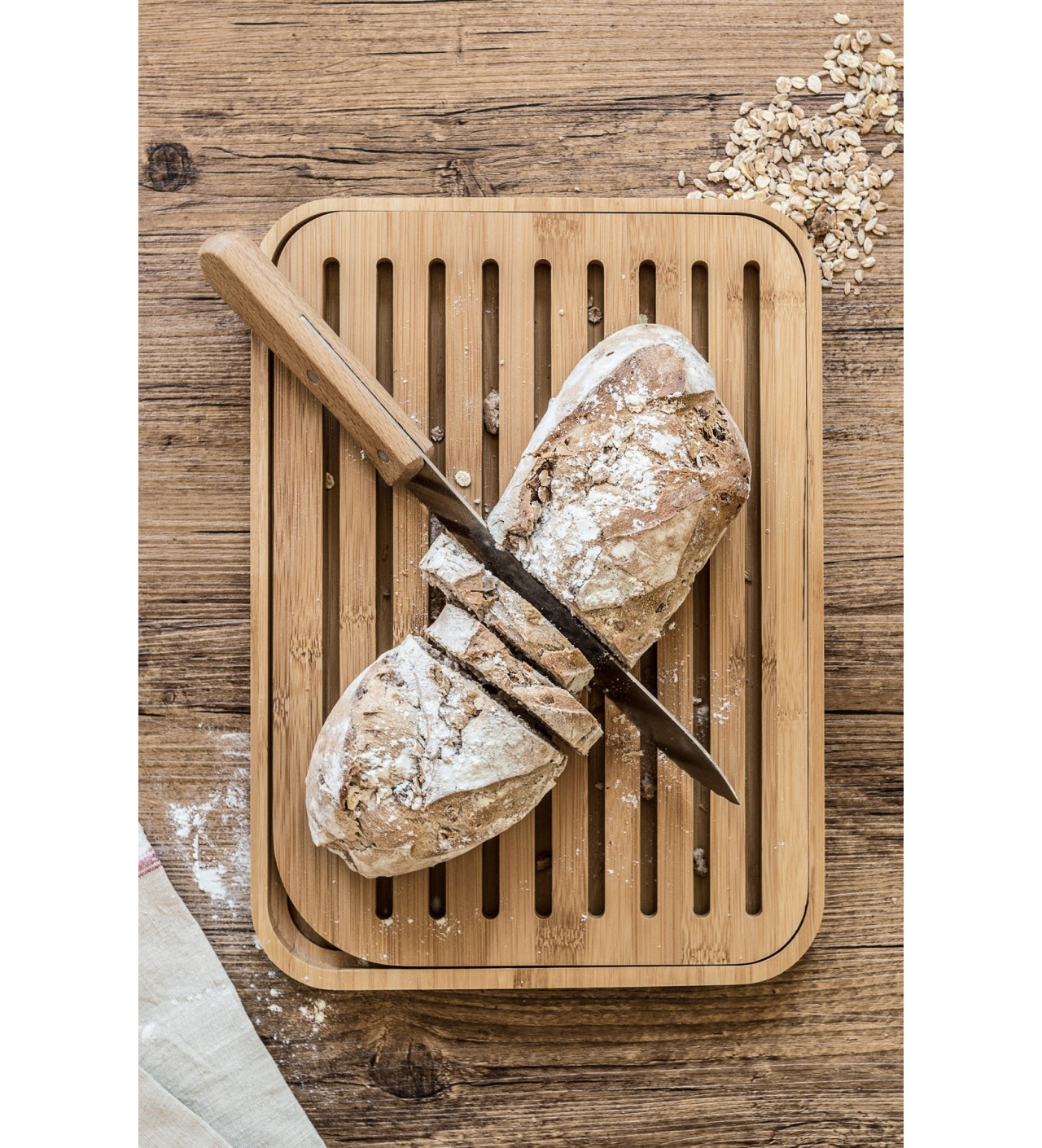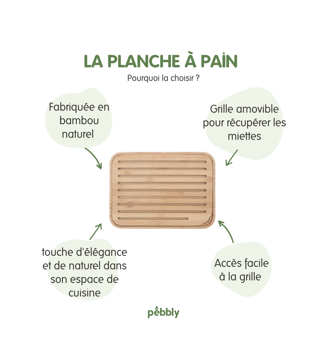 En somme, la planche à pain en bambou Pebbly est l’outil idéal pour couper le pain, préparer des sandwichs et récupérer efficacement les miettes après la découpe.