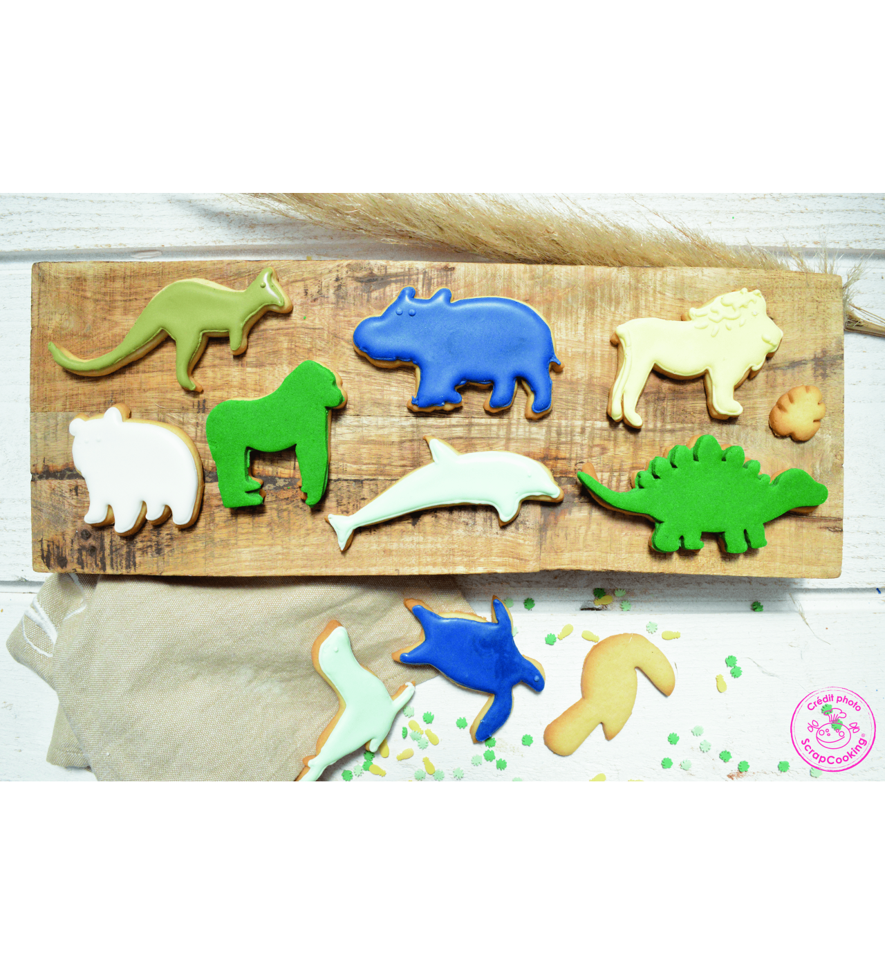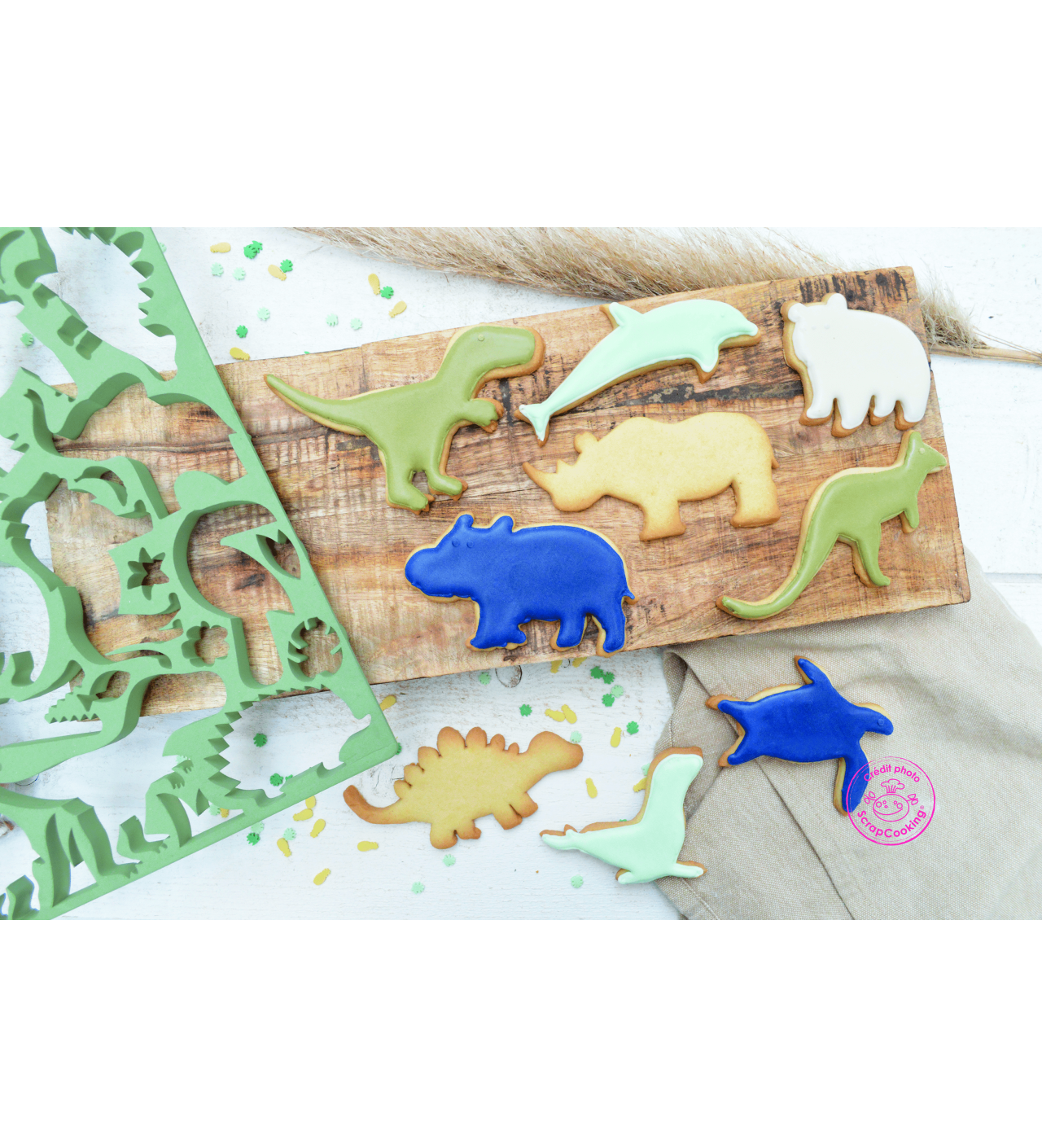 Pour pâtisser en compagnie de vos enfants il n'y a rien de mieux que faire des petits biscuits. Et pour rendre l'expérience plus amusante encore, pourquoi ne pas les faire en forme de petits animaux ? Scrapcooking vous propose une plaque d'emporte-pièces parée de motifs animaliers. Dinosaures, dauphins, et lions se côtoient sur les 30 x 25 cm de la plaque en plastique. Vos enfants seront ainsi deux fois plus heureux de vous aider en cuisine et ils pourront être fiers de faire leurs propres biscuits. Et soyez sûrs que vos chérubins mangeront sainement puisque la plaque à découpoirs est tout à fait adaptée au contact alimentaire.