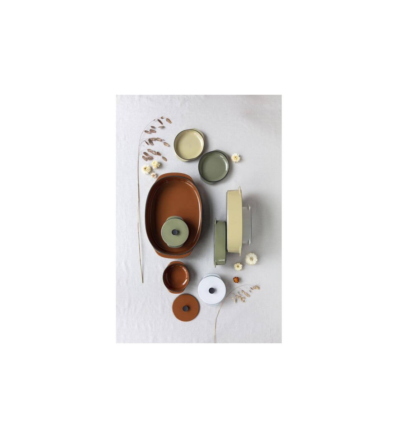 Pour ce qui est de l'esthétique du plat en céramique, ses courbes sont pensées pour être agréables à l'œil et sa couleur cannelle apporte chaleur et vie à la table. Le talon du plat de cuisson rend l'entièreté du design plus léger tandis que le liseré noir constitue la finition élégante de cet ustensile.