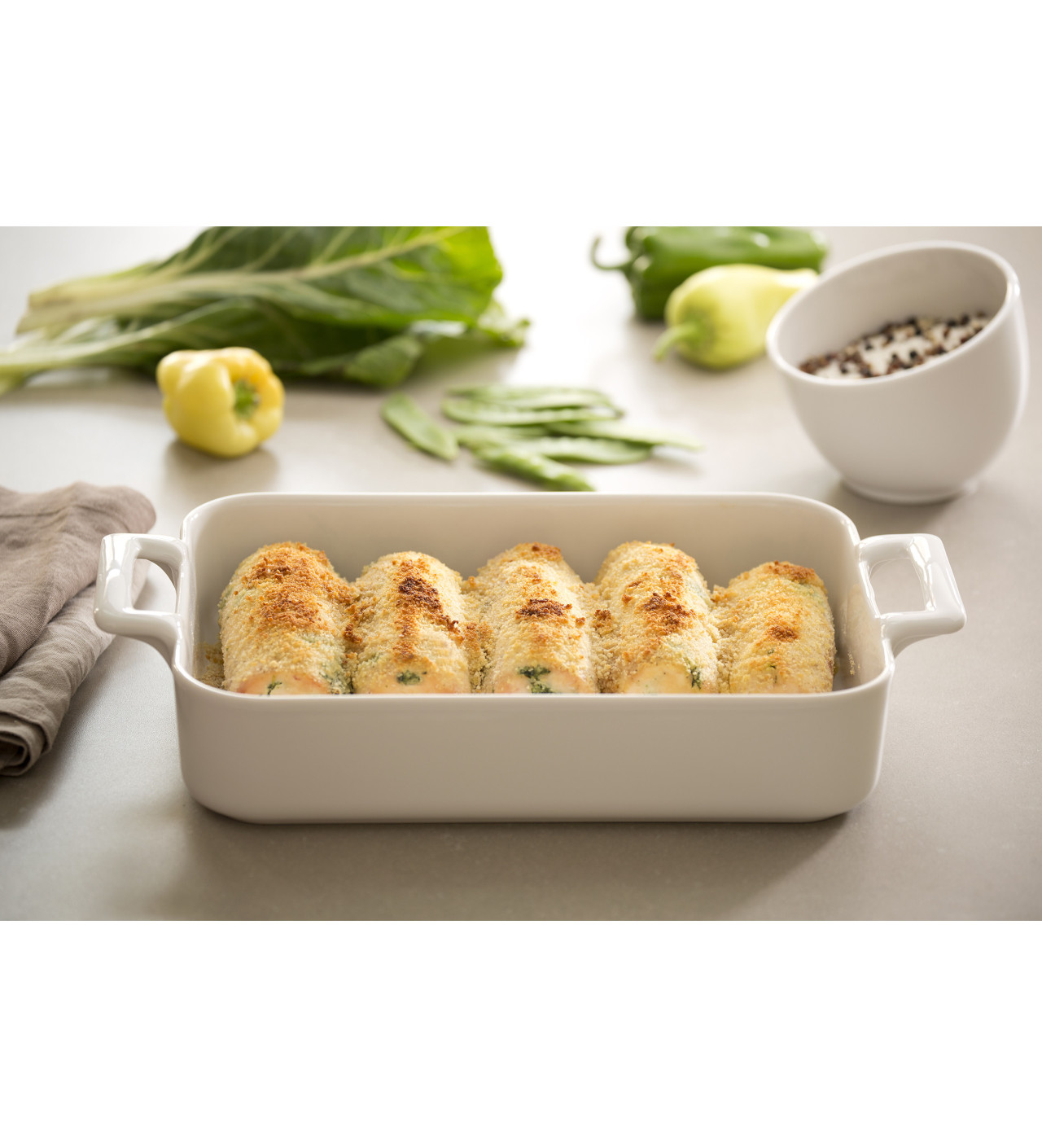 Le plat rectangulaire Revol de Belle Cuisine est muni de 2 anses issues du même bloc que le corps du plat pour assurer une solidité exceptionnelle et une manipulation facile.