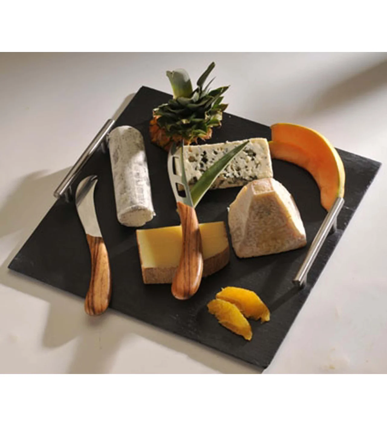 LeBrun présente ce plateau à fromage en ardoise carré gravure centrale au laser avec ses poignées métalliques. Ce plateau s'accompagne d'un tartineur ainsi que d'un couteau à fromage avec le manche en bois clair.