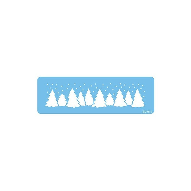 Ce pochoir au format frise, avec des dimensions de 18,7 x 4,6 cm, permet de décorer vos gâteaux d’une jolie bande continue représentant une forêt dense de sapins, idéale pour un thème de Noël.