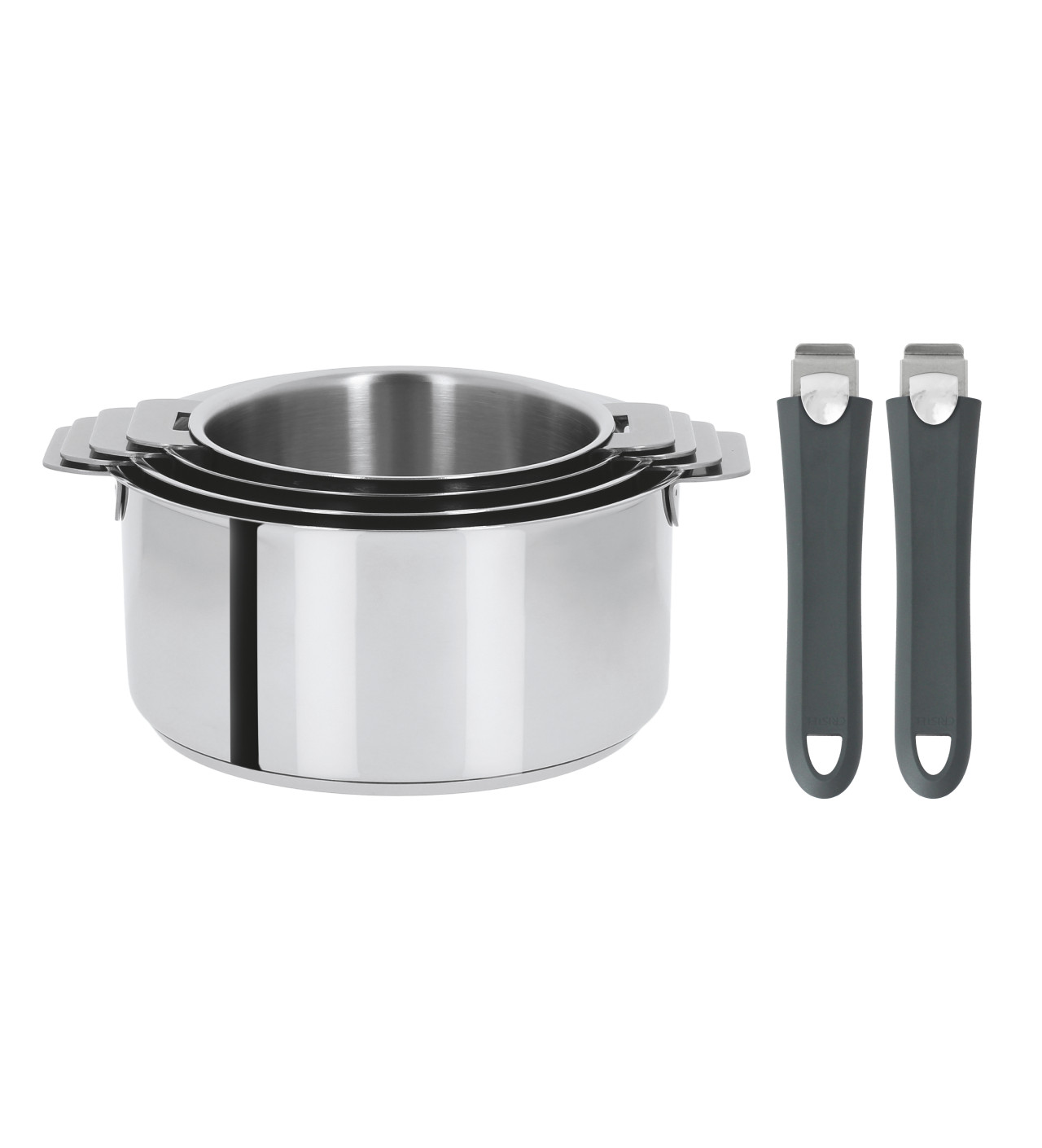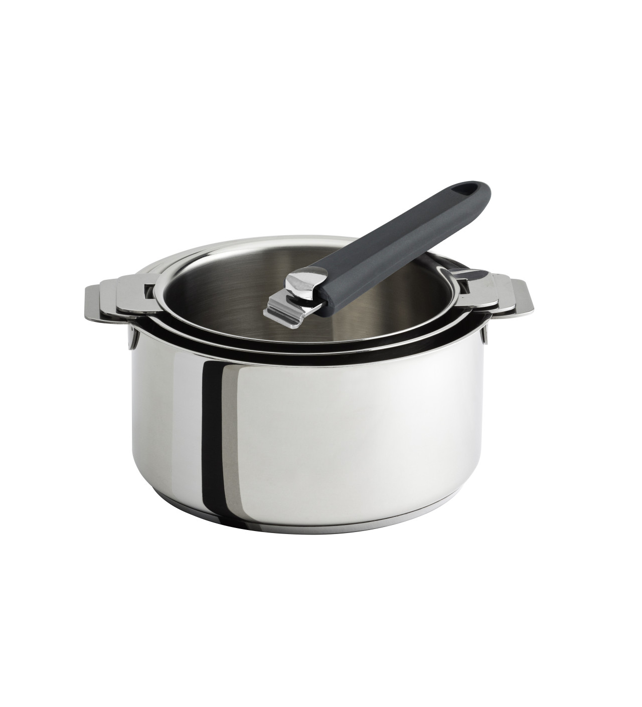 Cristel révolutionne le rangement de votre cuisine avec la collection Mutine à manche amovible. Grâce à son concept innovant de poignée amovible, emboitez désormais vos poêles, casseroles et fait-tout en toute facilité. Une seule poignée pour tous ces ustensiles, qui se range discrètement à l'intérieur d'une casserole pour un gain de place optimal.