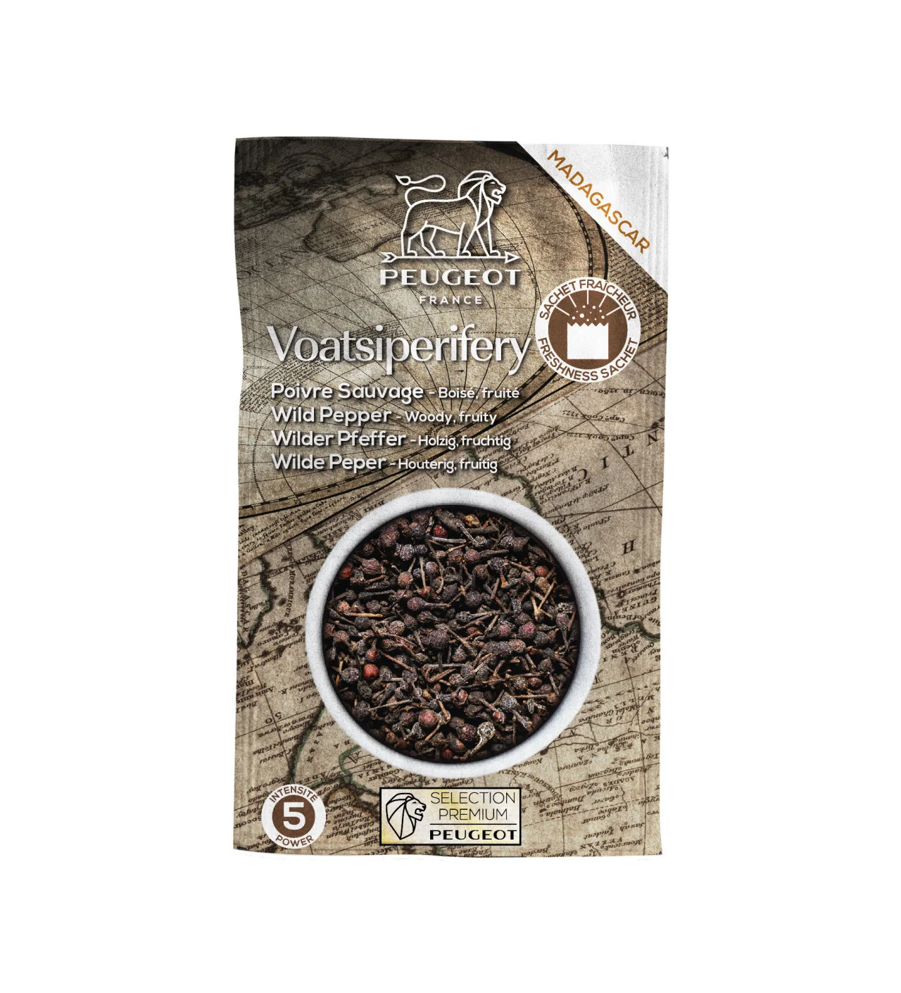 Laissez-vous séduire par l'exceptionnel Poivre Sauvage de Voatsiperifery Sachets 20 g (x3) Peugeot, un poivre rare et raffiné originaire de Madagascar.