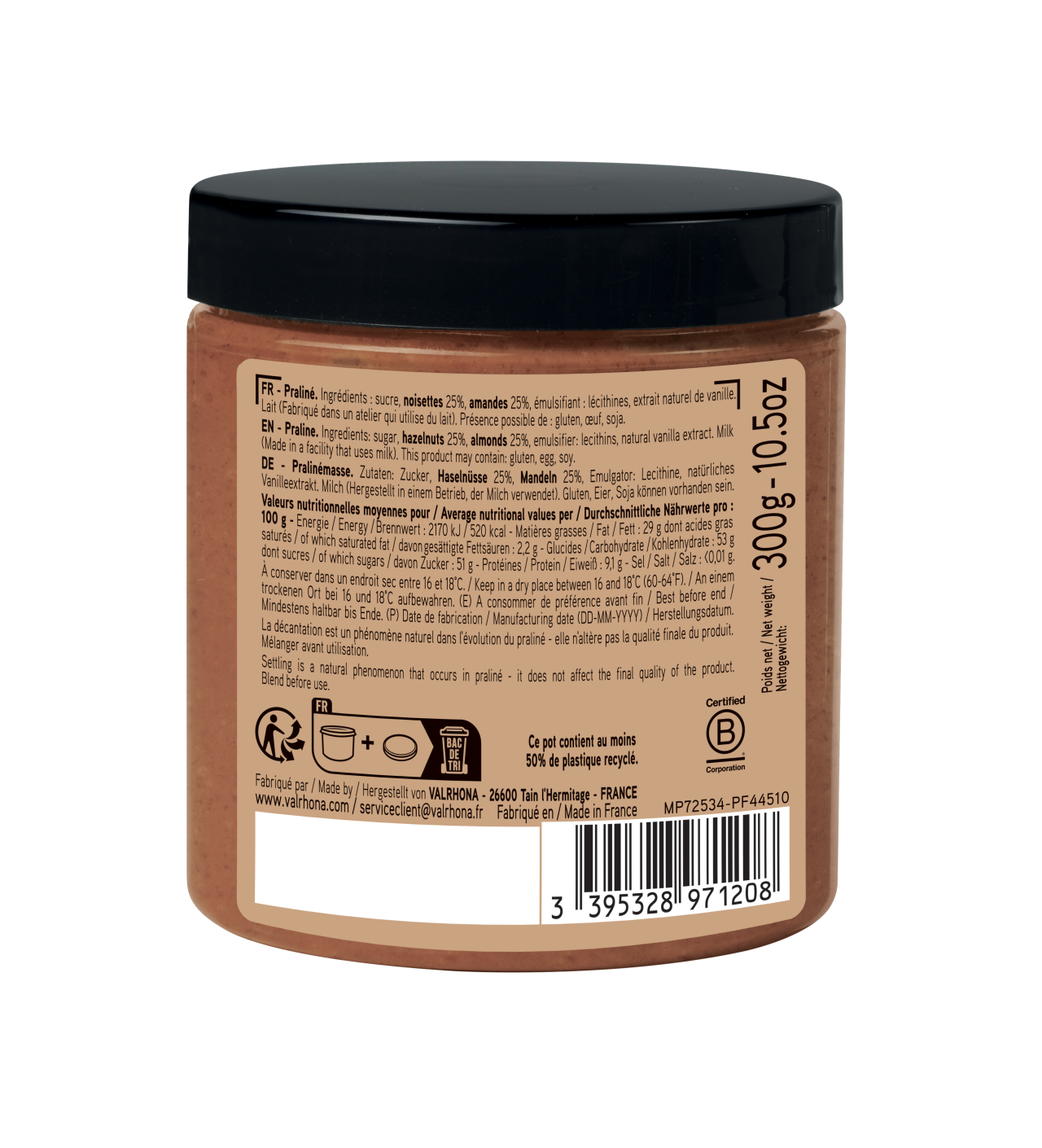 Avec sa texture croquante inédite et son savant mélange de 50% d'amandes et de noisettes, ce praliné incarne le savoir-faire artisanal de la marque Valrhona, fièrement Made in France. Conditionné dans un pot en plastique PET 50% recyclé, il est également respectueux de l'environnement.