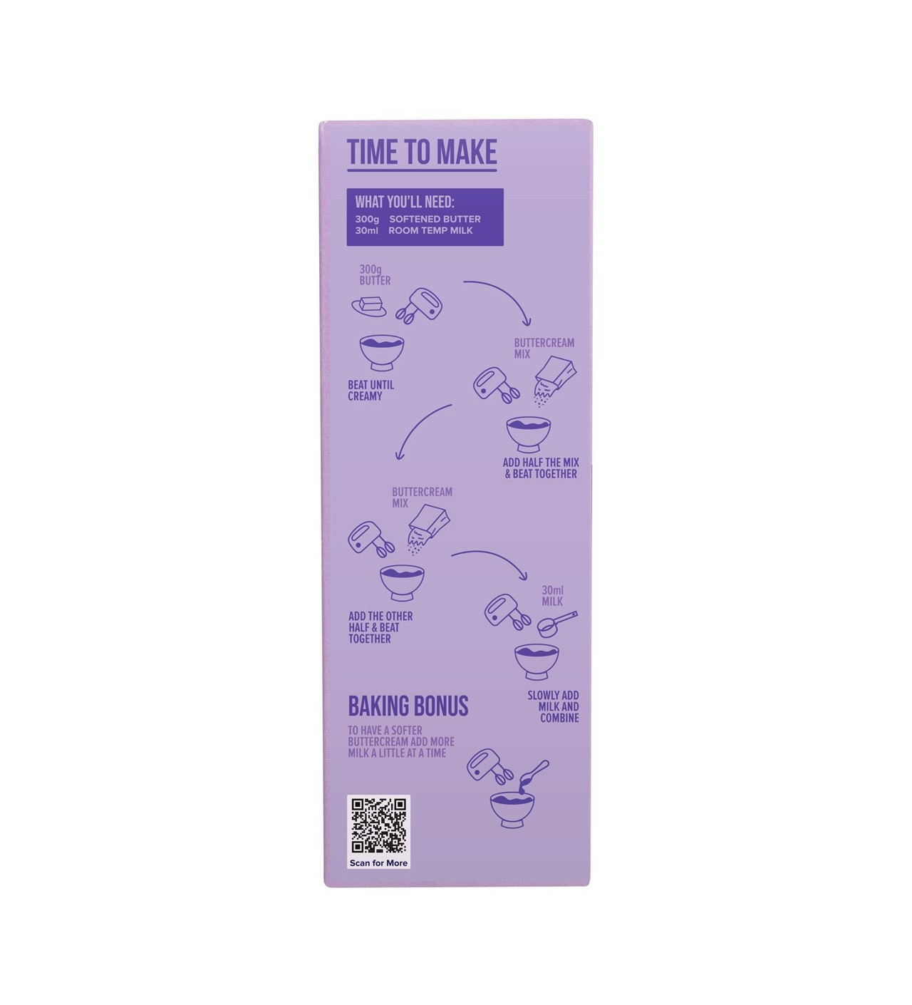 Avec cette préparation gâteau, obtenez une crème au beurre à la texture légère et onctueuse qui s’étale et se tient parfaitement, idéale pour garnir ou glacer vos gâteaux, cupcakes et desserts. Pour obtenir une crème délicieusement aérienne, il suffit de mélanger 450 g de préparation en poudre avec 300 g de beurre mou et 30 ml de lait.