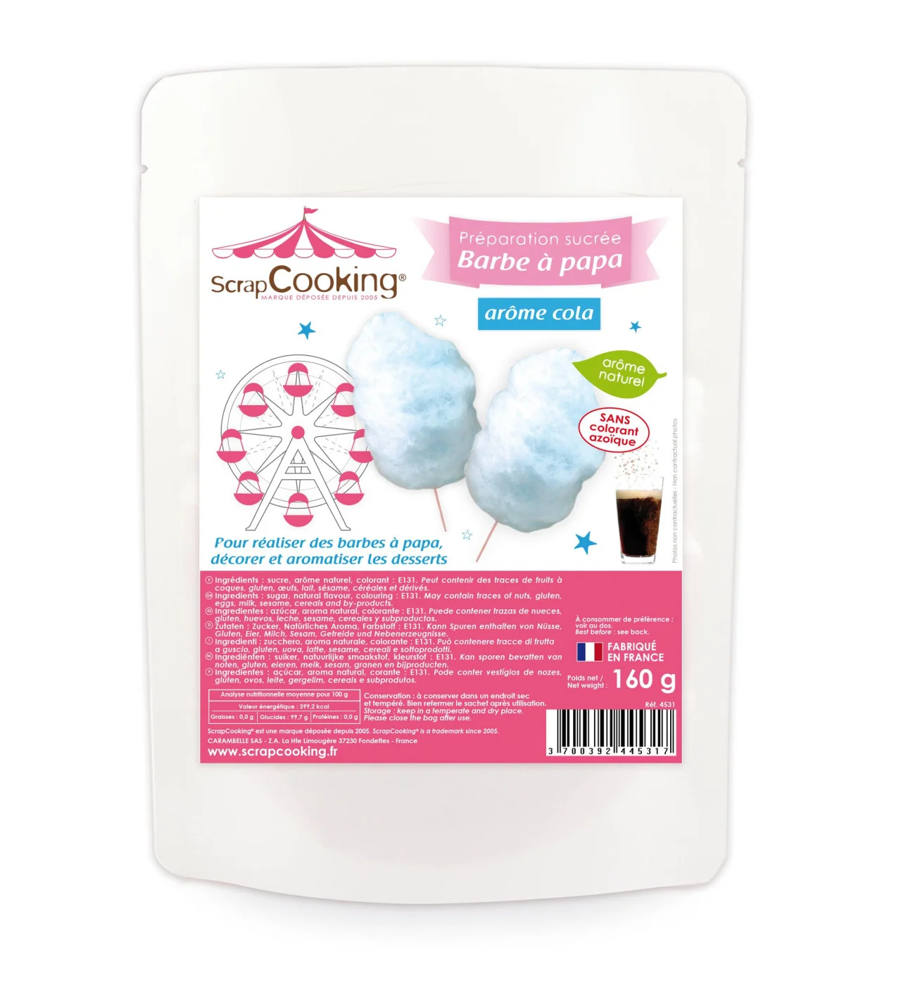 Avec cette préparation sucrée de Scrapcooking, réalisez facilement de délicieuses Barbe à papa bleues, comme dans les fêtes foraines ! Il suffit de verser le sucre coloré et aromatisé dans la machine sans aucun ajout pour que les films de sucre typique de la barbe à papa se forment.