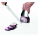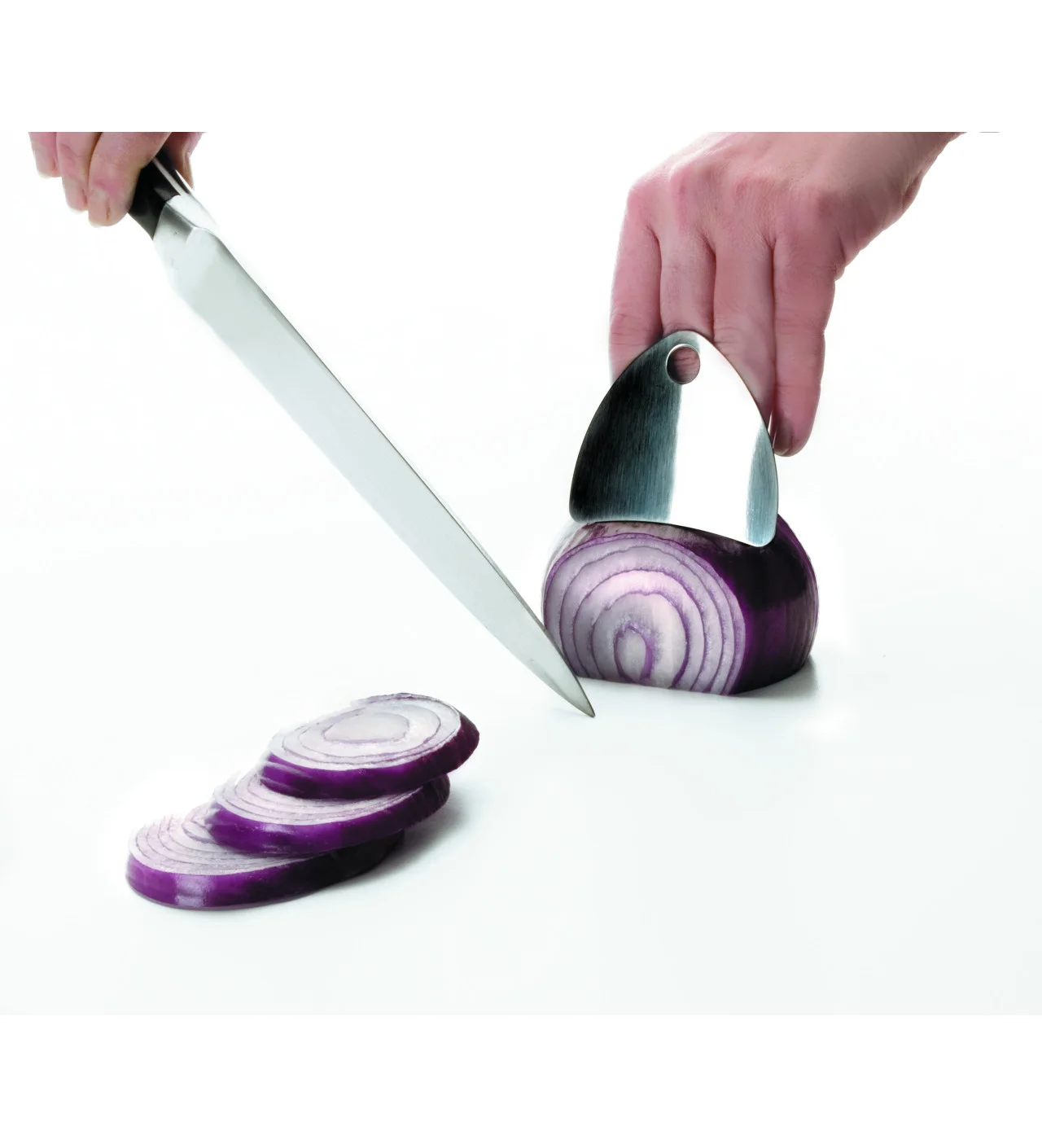 Placez vos doigts dans le Protège Doigts Inox et tenez votre oignon, pour le découper sans avoir peur de se couper, puisque l'inox vous protégera de la lame de votre couteau.