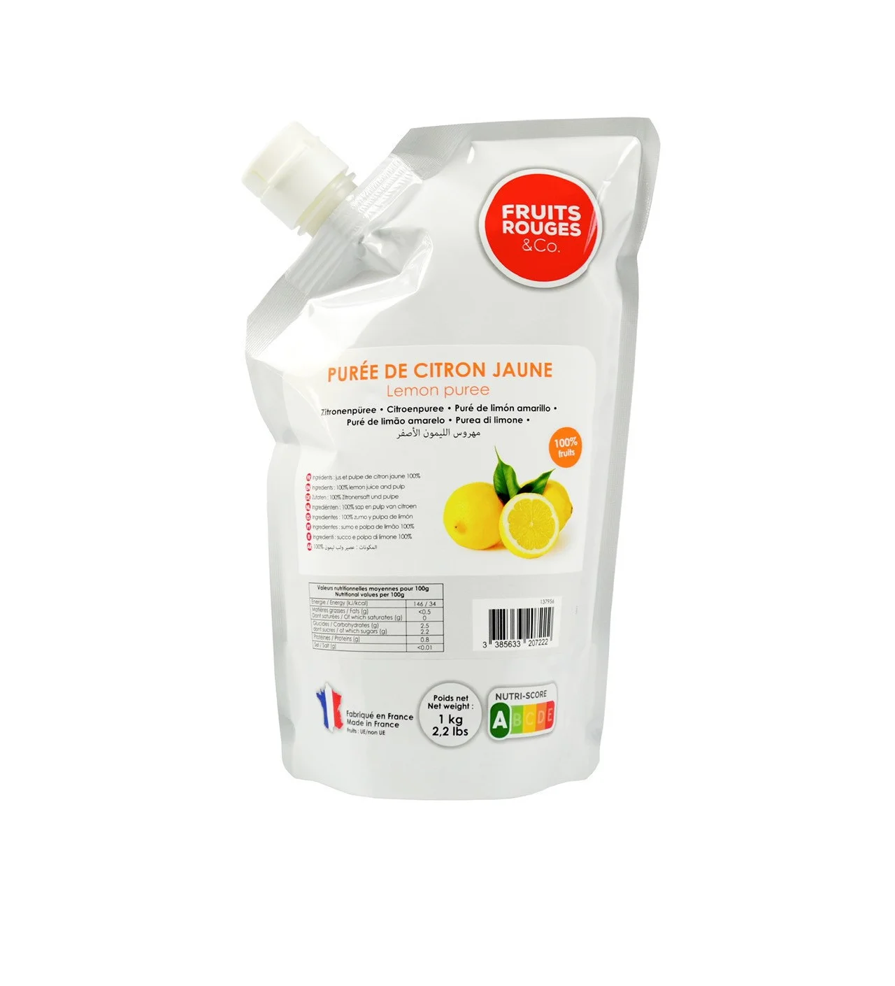 Découvrez la Purée de Citron Fruits Rouges & Co, une purée de fruit qui ajoutera une pointe d'agrume dans toutes vos recettes : sorbet, glace, crème au citron, lemon curd, mousse au citron etc... La purée de citron jaune est conditionnée en poche pasteurisée de 1 kg et prête à l'emploi, elle pourra s'utiliser comme ingrédient principal d'innombrables recettes salées ou sucrées.