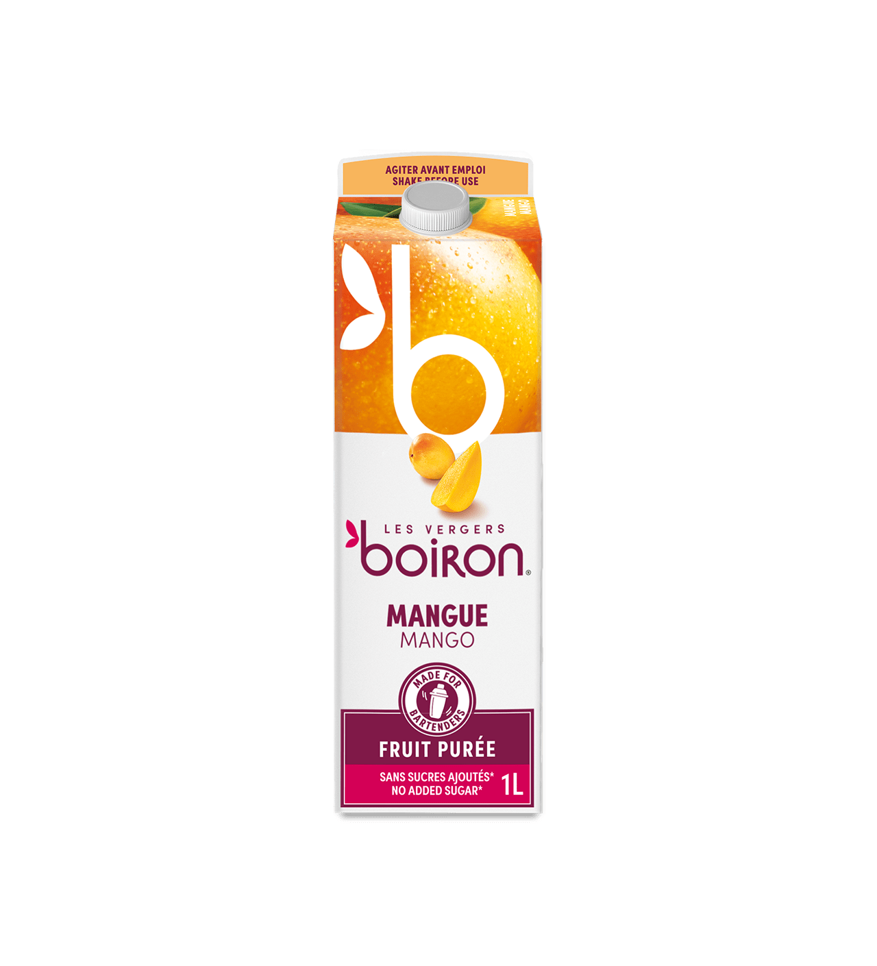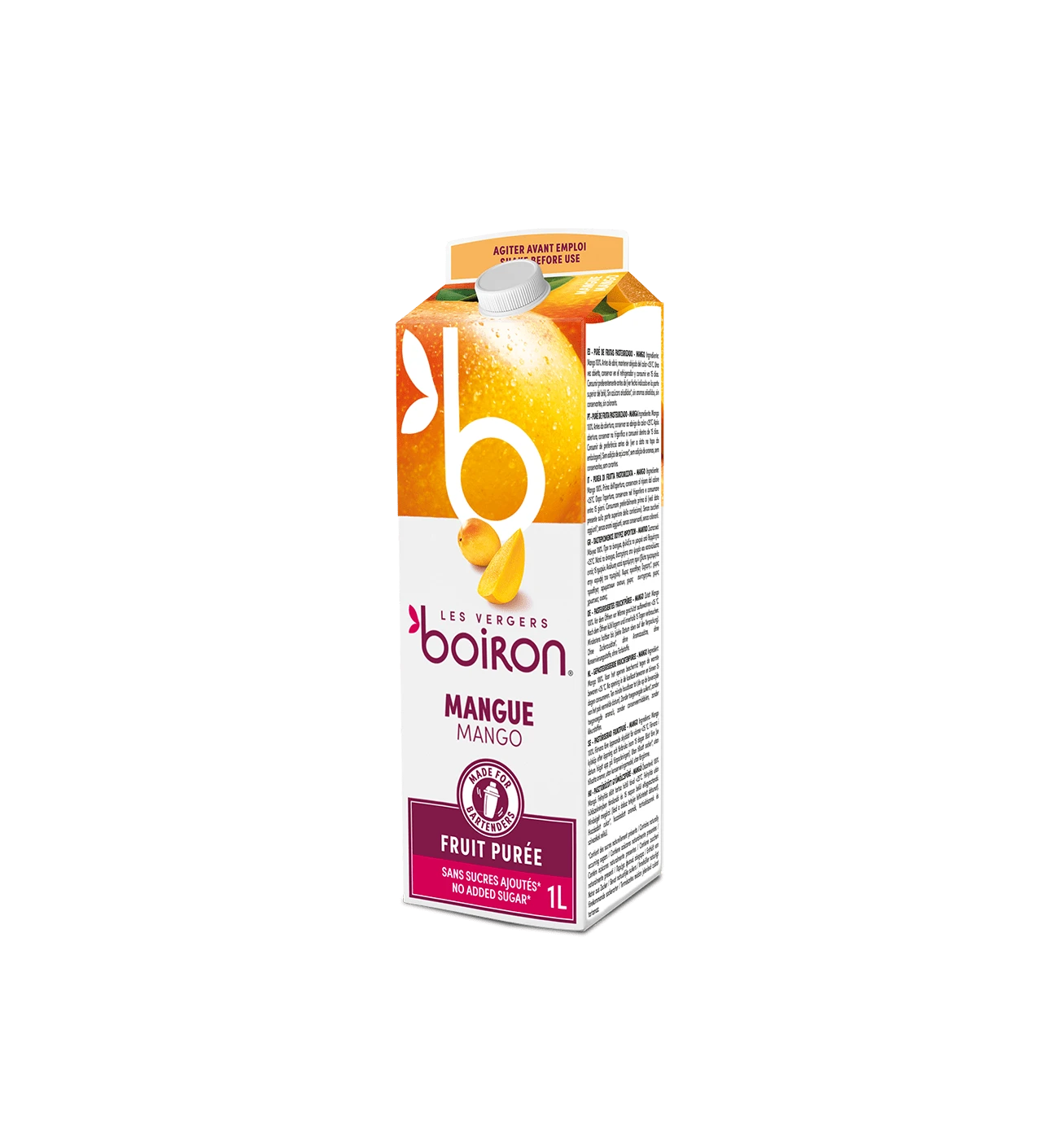 Conditionnée dans une bouteille en carton d'1 L, la purée de mangue Boiron est à conserver au sec et au frais. Le bec verseur de la bouteille est bien pratique et ergonomique pour le service, et la bouteille est refermable aisément.