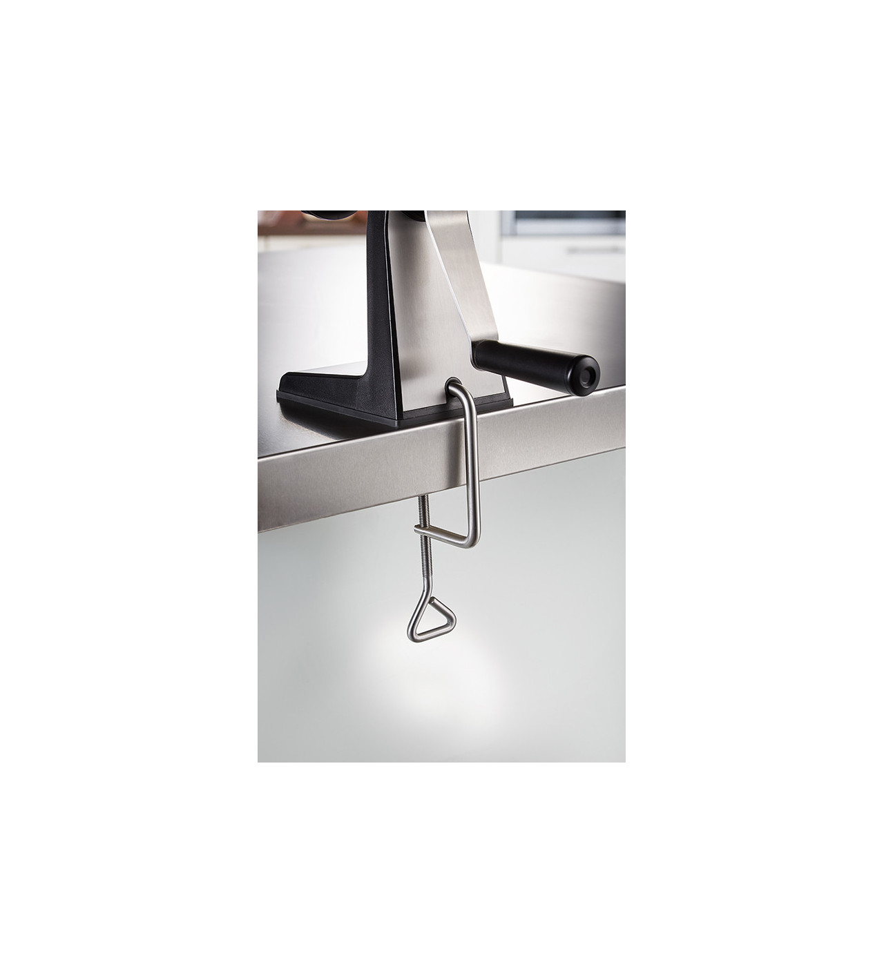 La manivelle qui fait fonctionner la râpe de cuisine Gefu est facile à actionner et vous permet d’épargner vos efforts. Un poussoir est fourni pour un usage sûr, et le support est simple à fixer pour s’assurer que la râpe restera bien en place sur votre comptoir.